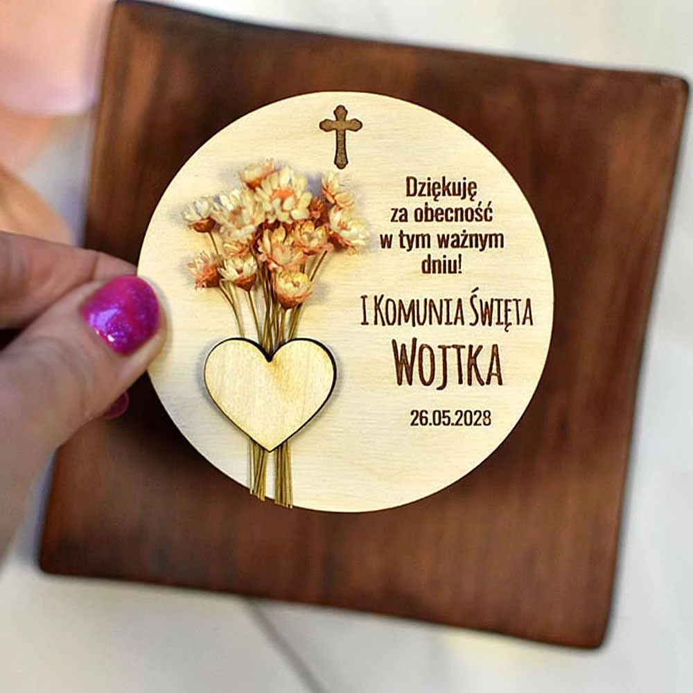 Przepiękny magnes na lodówkę z suszonymi kwiatami - wyjątkowy prezent dla Waszych gości. Magnes będzie świetnie pasował do stylu boho uroczystości, jak i dekoracji rustykalnych czy wiejskich. Na magnesie znajduje się okolicznościowy napis, ale można go zmienić i dostosować do każdej okazji jak Chrzest Święty, I Komunia Święta, ślub, rocznica, urodziny, prezent dla nauczycieli na zakończenie roku szkolnego czy eko gadżet firmowy dla klientów itp.