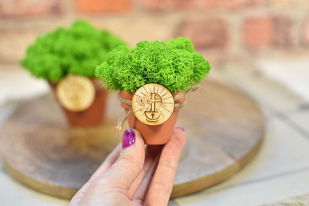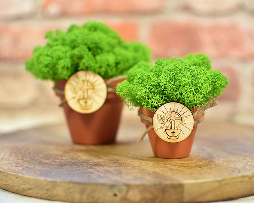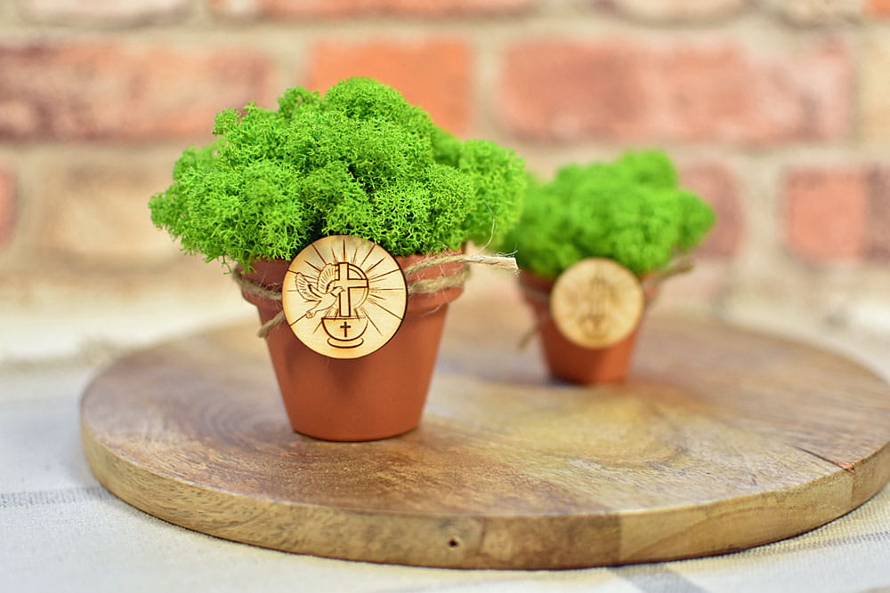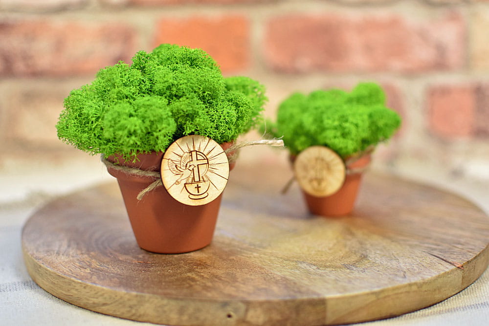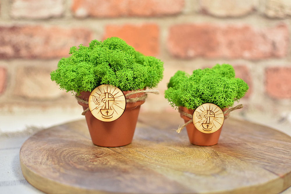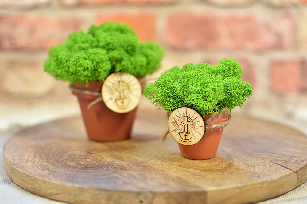 Ekologiczne pamiątki dla gości z okazji Chrztu - doniczki z mchem chrobotkiem i plakietka z chrzcielnicą.