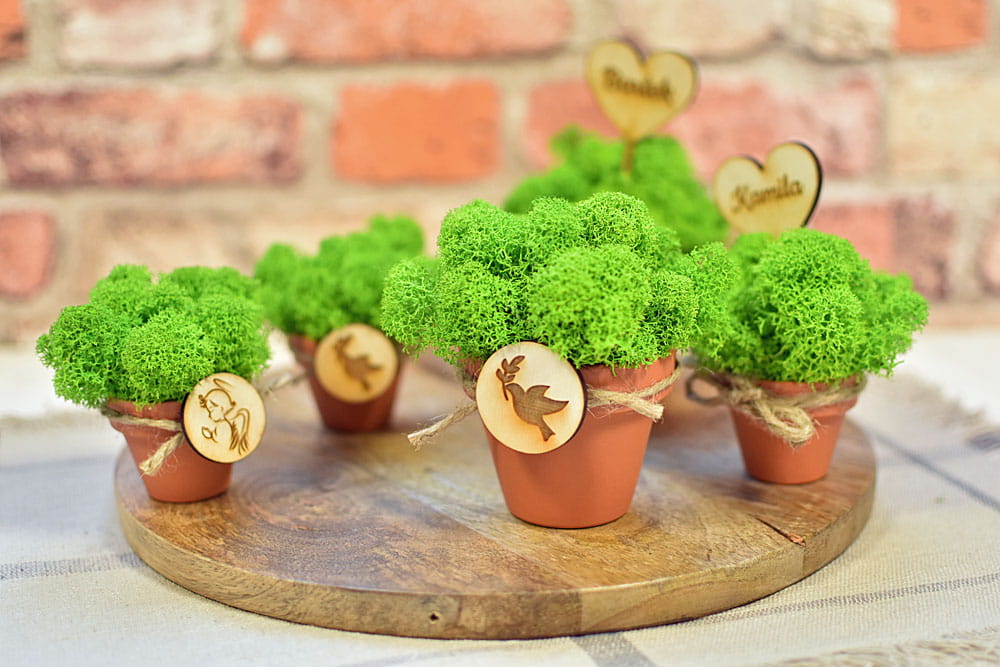 drobne pamiątki dla gości na Chrzcinach, doniczki z naturalnym mchem i plakietką D2