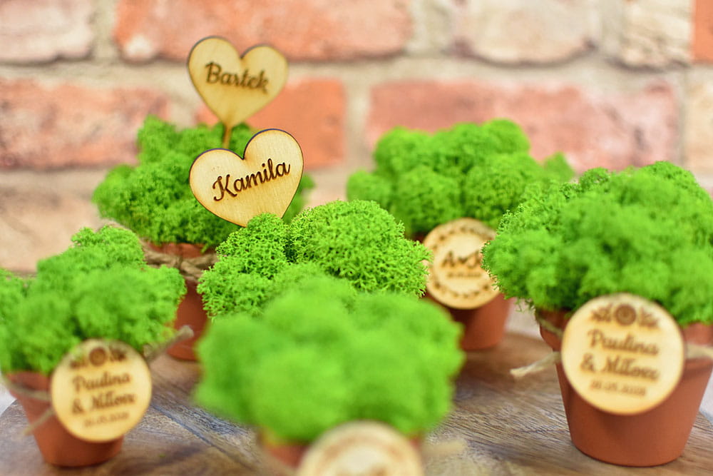 Doniczka jest ozdobiona okolicznościową plakietką nawiązującą do uroczystości. Można także zamówić wersję z imionami gości na pikerach w kształcie serc. Cała kompozycja będzie się pięknie prezentować przez długie lata na półce, biurku lub parapecie, gdyż mech zachowuje swoje właściwości nawet 10 lat. W zależności od wzoru, na plakietce można podać własny tekst i dostosować upominek do dowolnej okazji jak ślub, urodziny, rocznica, zakończenie szkoły, wieczór panieński, dzień kobiet itp.