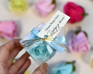 Drobny upominek dla gości - róża mydlana w pudełeczku z tasiemką i bilecikiem.
