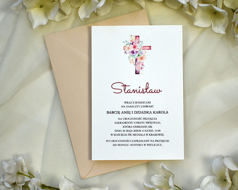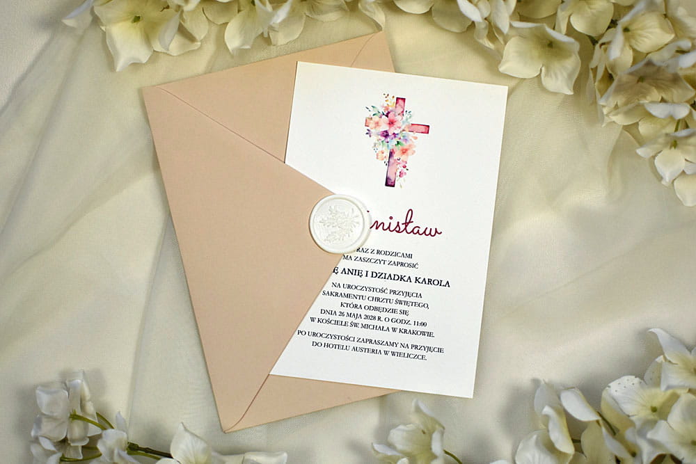 Urokliwe i niebanalne zaproszenie na Chrzest Święty lub Komunię Świętą. W zależności od potrzeby każde zaproszenie możemy dostosować do uroczystości Chrztu lub Komunii. W przypadku zaproszeń z ozdobnym wiankiem - w środku można umieścić krzyżyk, inicjał dziecka lub napis IHS i w ten sposób zmienić charakter papeterii.