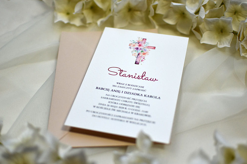 Proste, nowoczesne zaproszenie komunijne lub na Chrzest Święty z imieniem dziecka oraz kolorowym, akwarelowym krzyżem.