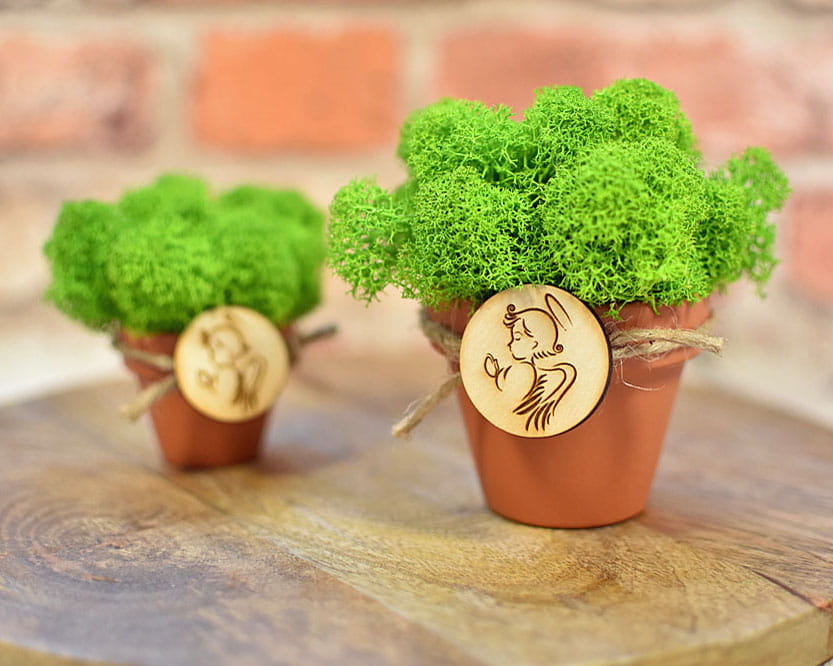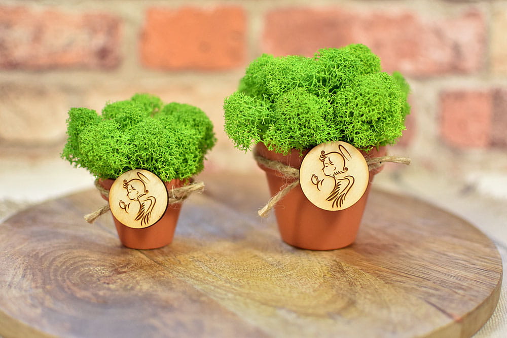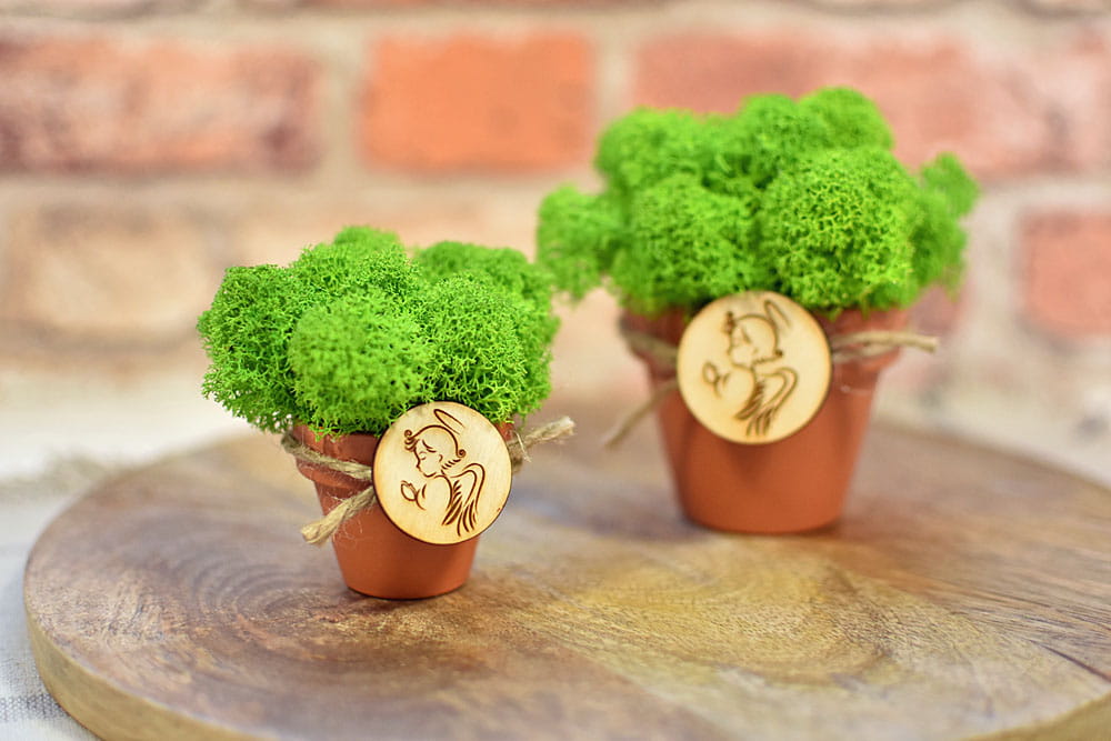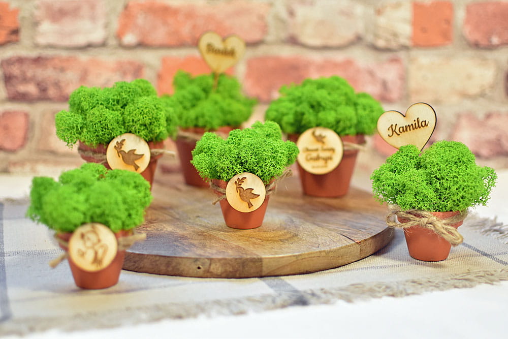 Doniczka jest ozdobiona okolicznościową plakietką nawiązującą do uroczystości. Można także zamówić wersję z imionami gości na pikerach w kształcie serc. Cała kompozycja będzie się pięknie prezentować przez długie lata na półce, biurku lub parapecie, gdyż mech zachowuje swoje właściwości nawet 10 lat. W zależności od wzoru, na plakietce można podać własny tekst i dostosować upominek do dowolnej okazji jak ślub, urodziny, rocznica, zakończenie szkoły, wieczór panieński, dzień kobiet itp.