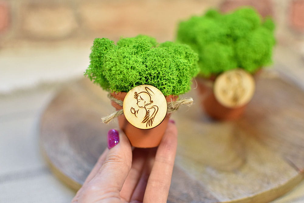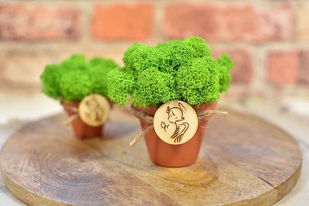 Drobny eko podarunek dla gości - mech chrobotek w doniczce i plakietka z aniołkiem, idealny na podziękowanie dla gości komunijnych i na Chrzest.