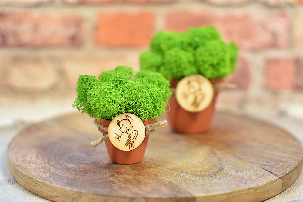 Pomysł na niecodzienny i wyjątkowy podarunek dla gości z okazji I Komunii Świętej lub Chrztu Świętego Waszego dziecka. Ceramiczna doniczka wypełniona naturalnym mchem chrobotkiem ze Skandynawii. Taki prezent wnosi element natury do wnętrza i nadaje przestrzeni wyjątkową, relaksującą atmosferę.