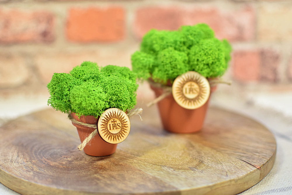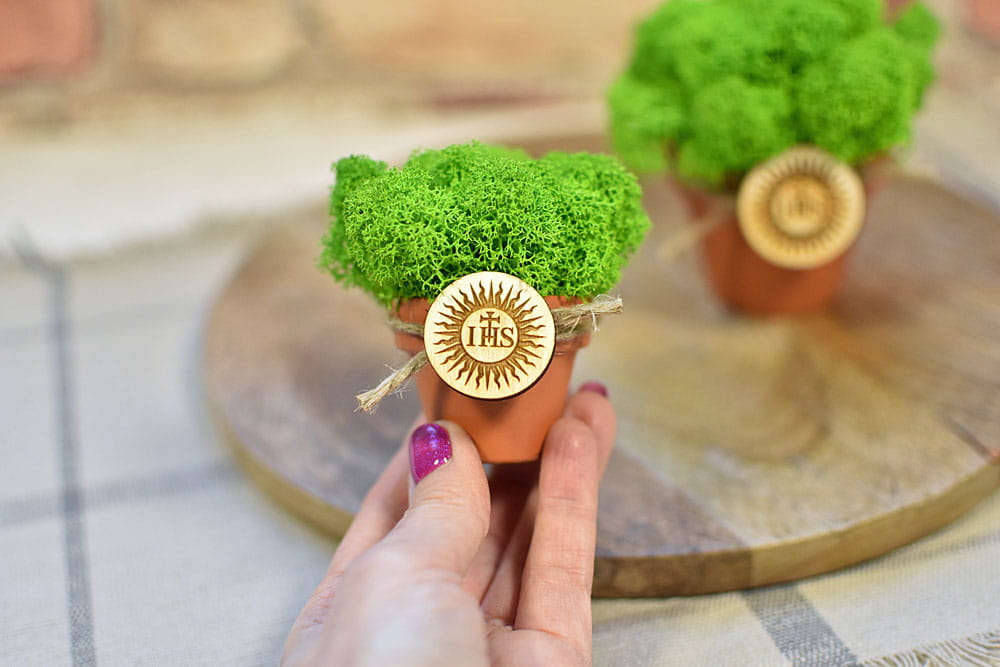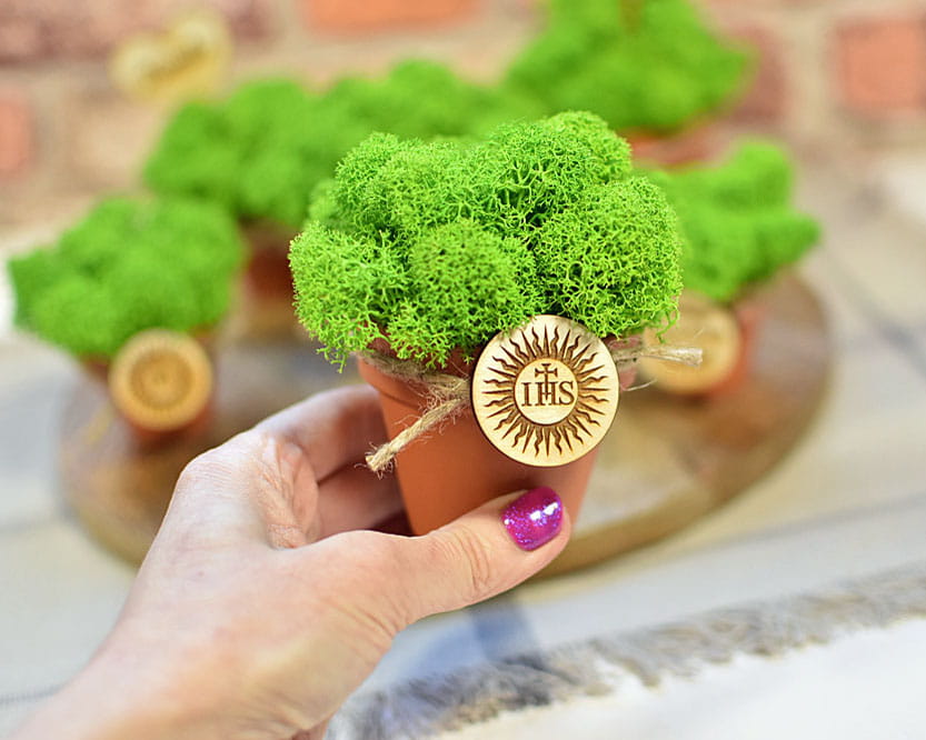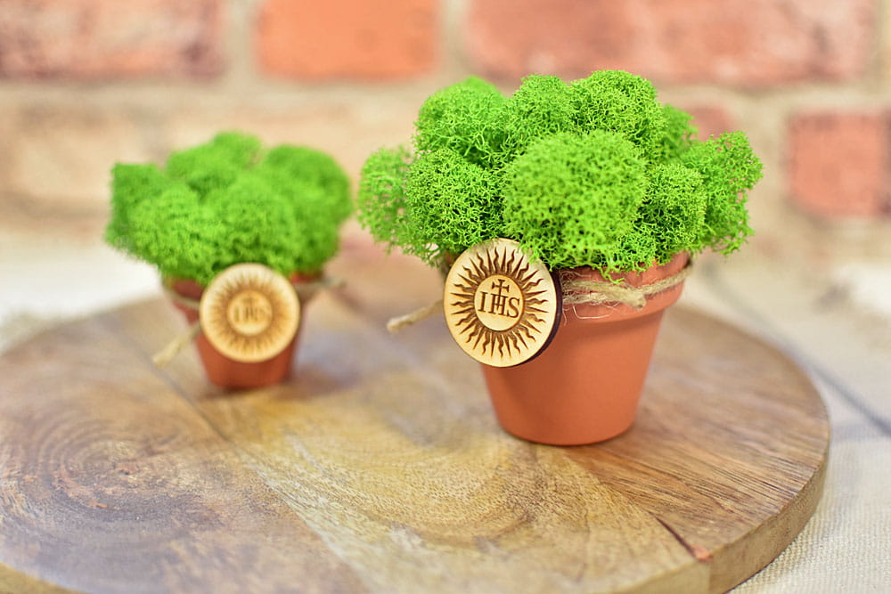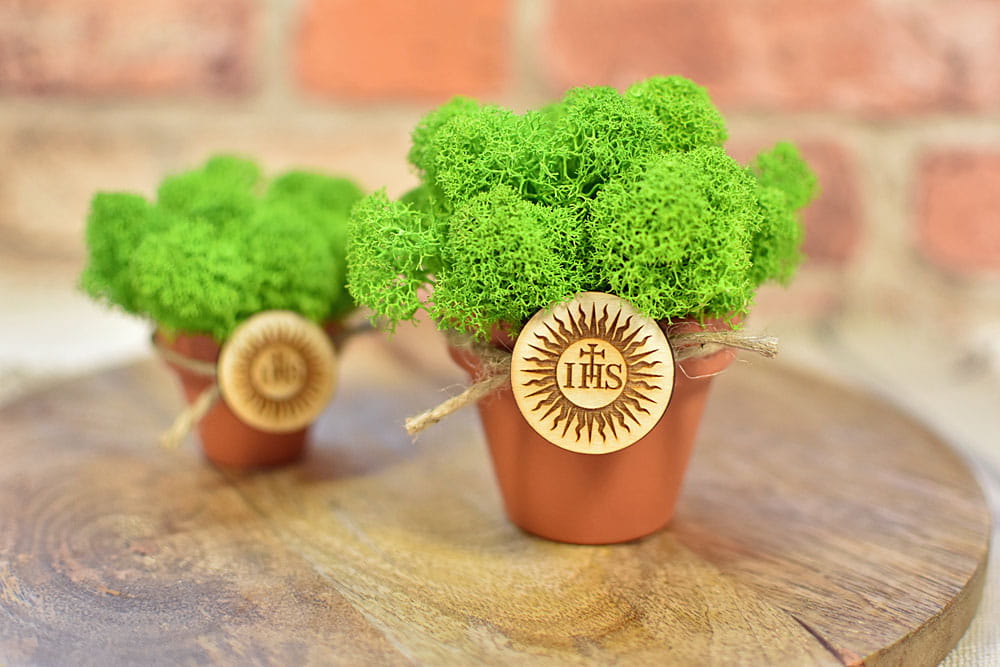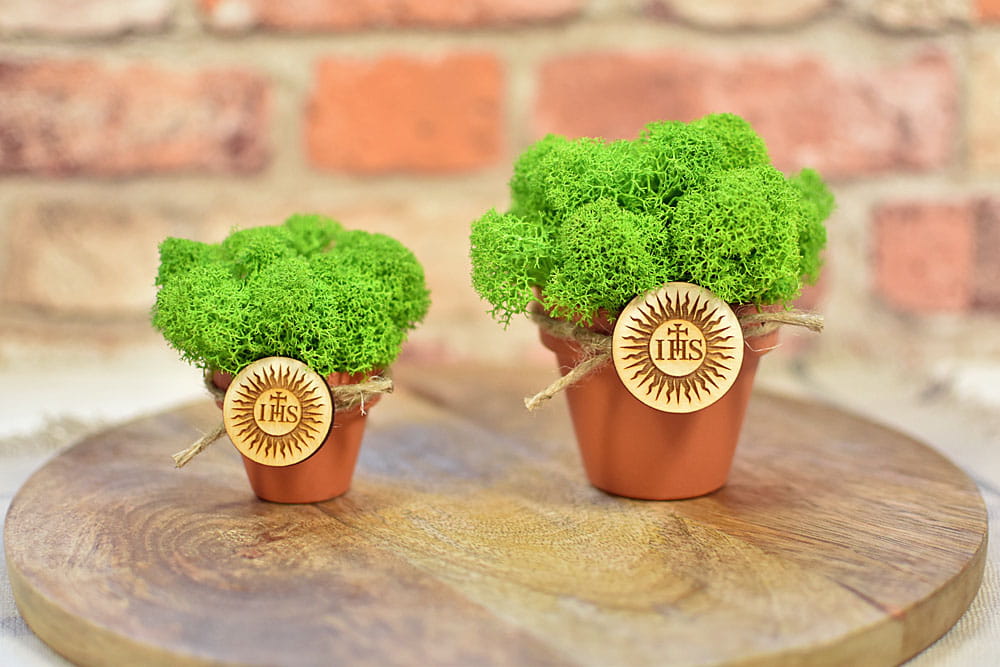 Zielony mech chrobotek w doniczce i plakietka ze znakiem IHS jako pomysł na podziękowanie dla gości z okazji I Komunii Świętej.