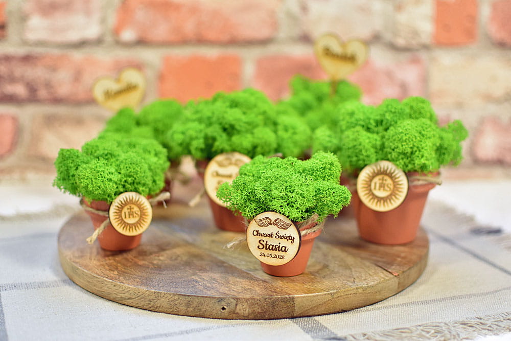 Pomysł na niecodzienny i wyjątkowy podarunek dla gości z okazji I Komunii Świętej lub Chrztu Świętego Waszego dziecka. Ceramiczna doniczka wypełniona naturalnym mchem chrobotkiem ze Skandynawii. Taki prezent wnosi element natury do wnętrza i nadaje przestrzeni wyjątkową, relaksującą atmosferę.