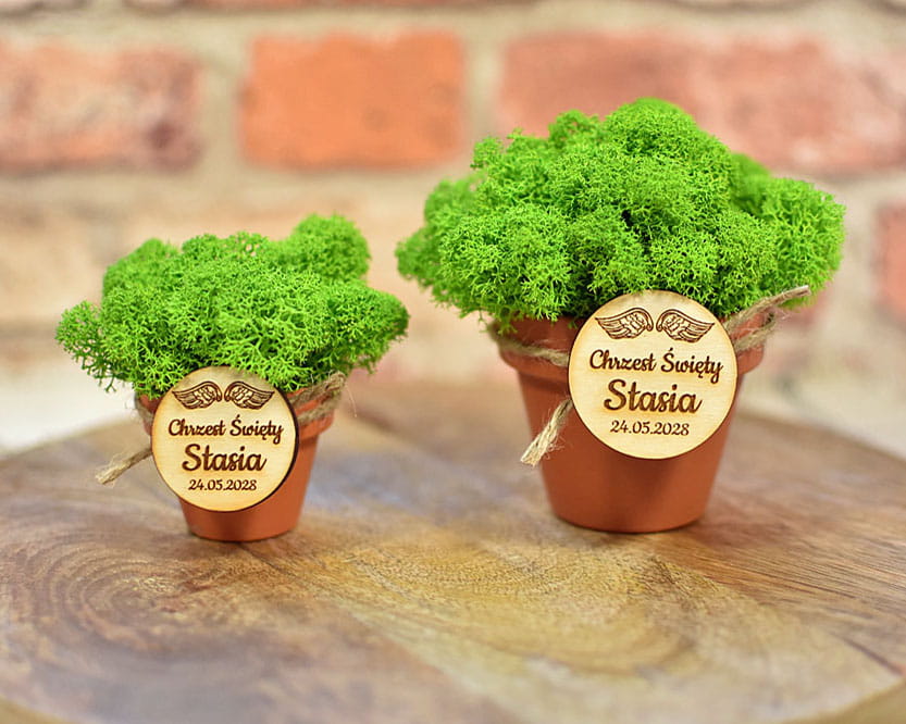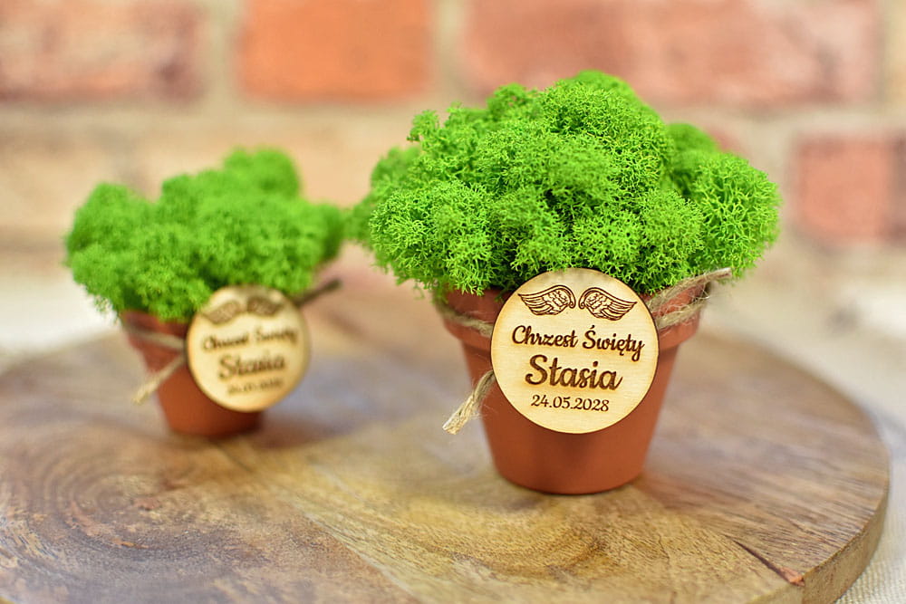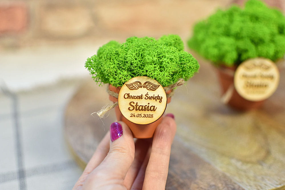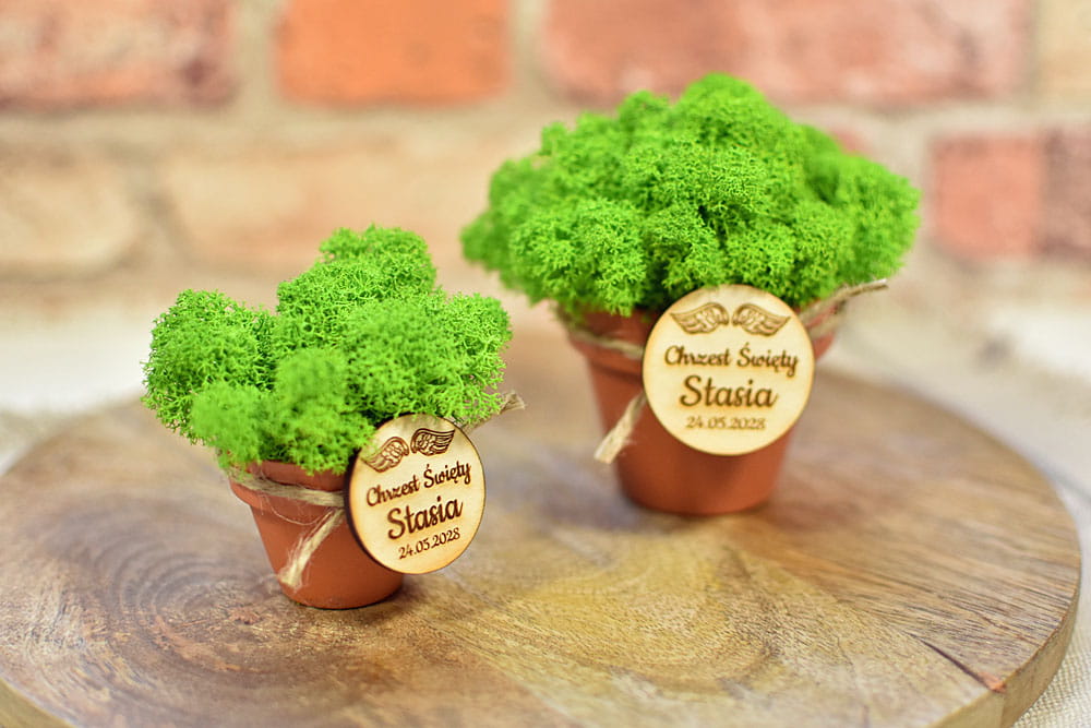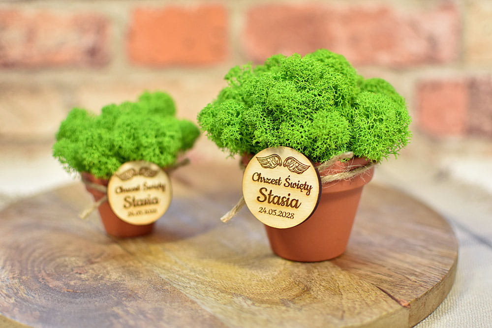 eko prezent dla gości na Chrzcie, dekoracja z żywego mchu w doniczce z plakietką D3