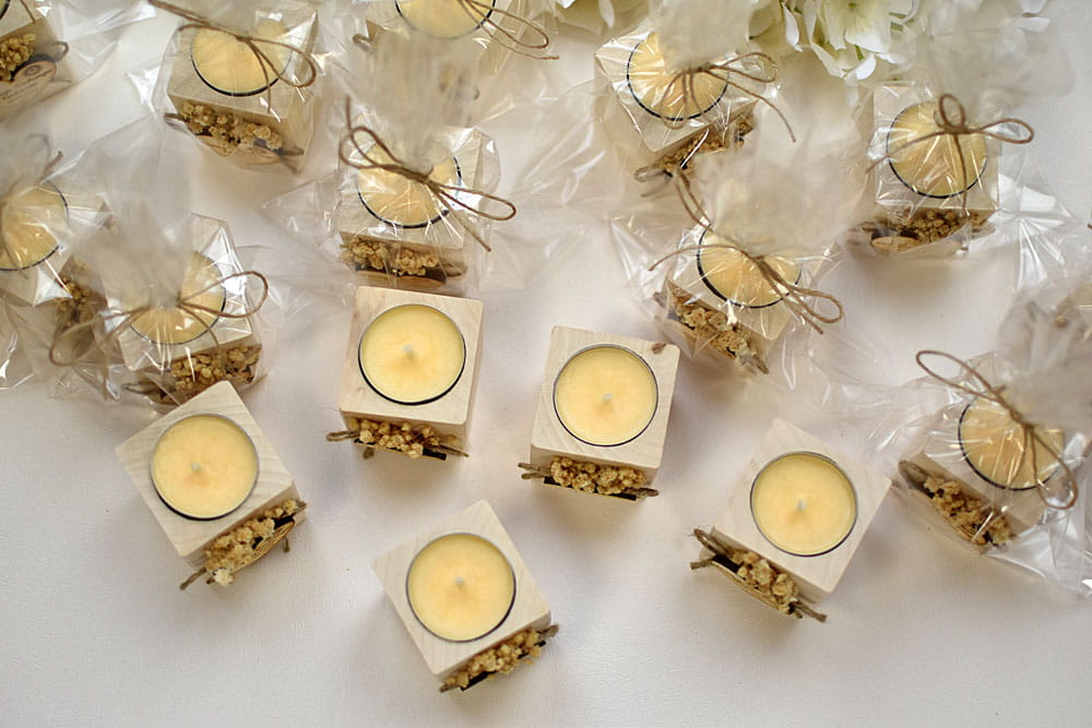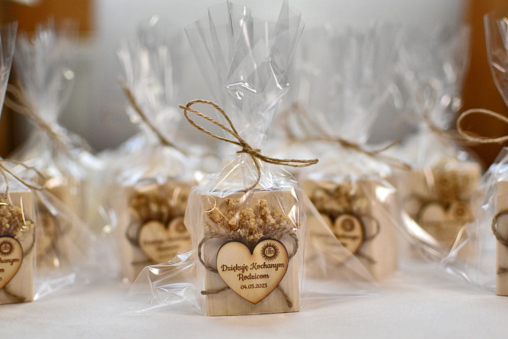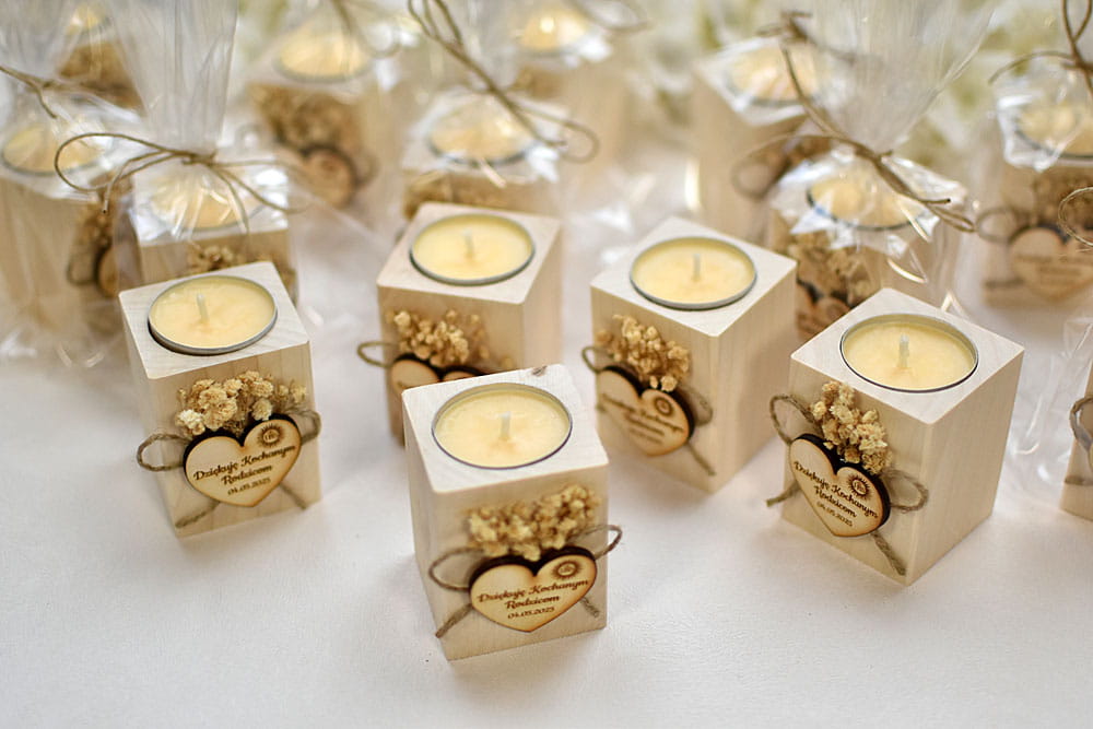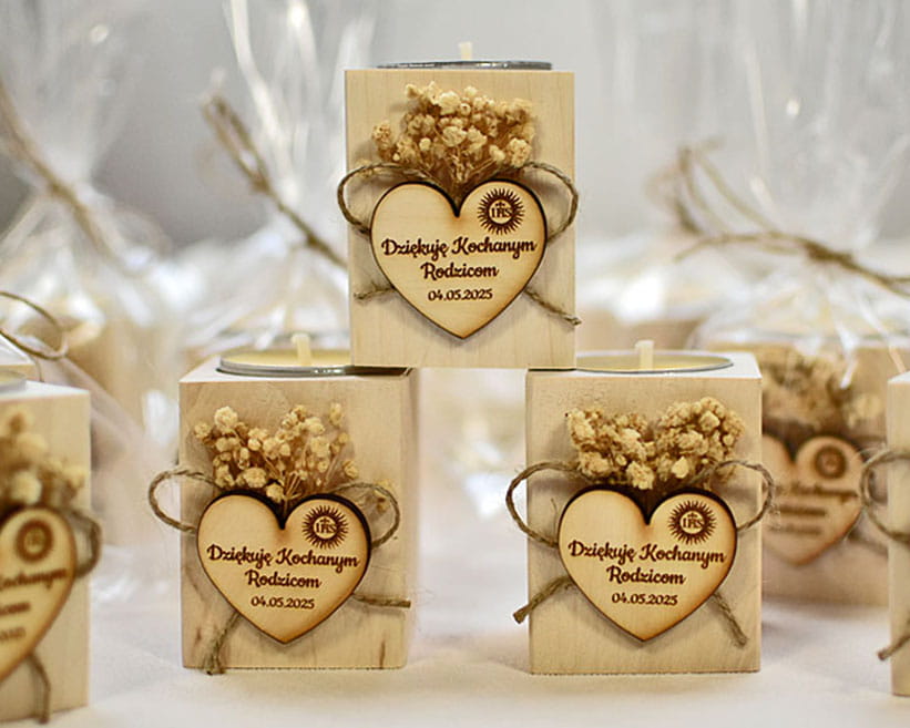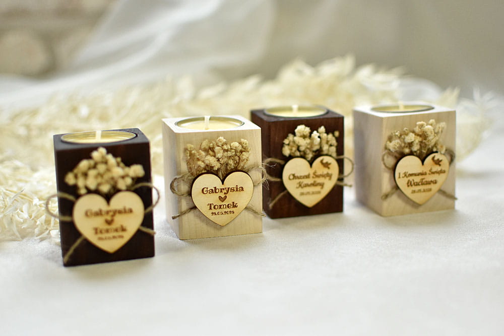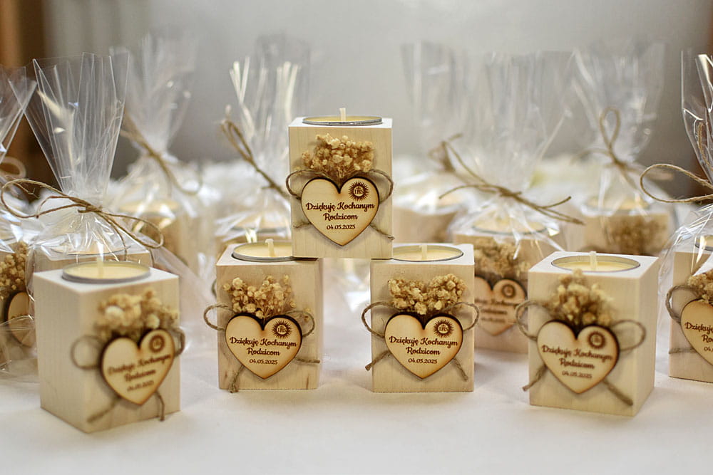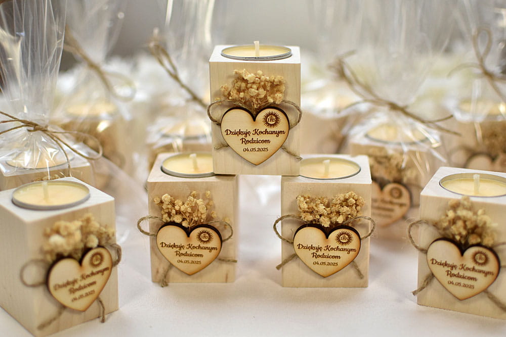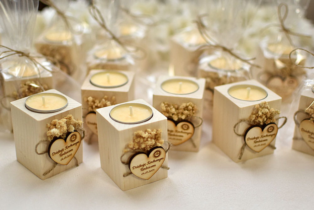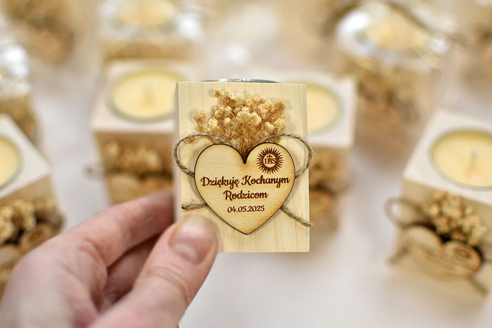 Niecodzienna pamiątka dla rodziców od dzieci z okazji Komunii Świętej - przepiękny drewniany świecznik w stylu boho. Świecznik jest ozdobiony suszonymi kwiatami gipsówki oraz serduszkiem z wygrawerowanym napisem nawiązującym do Waszej uroczystości. Dopełnieniem całej kompozycji jest pachnąca świeczka - wkład tealight wykonany przez nas z wosku sojowego. Świecznik jest pięknym ekologicznym prezentem, który przez długie lata będzie cieszyć gości. Po wypaleniu się świeczki można włożyć następny standardowy podgrzewacz.