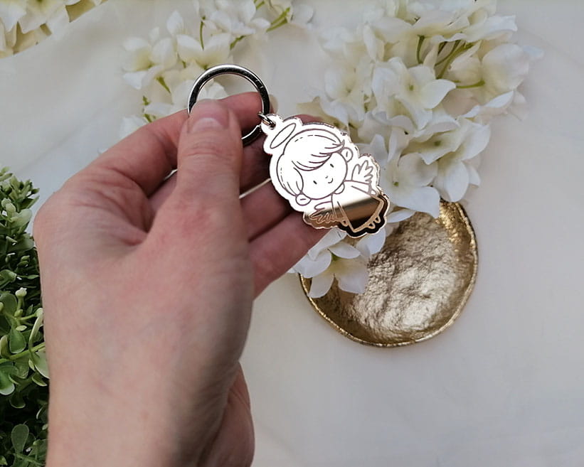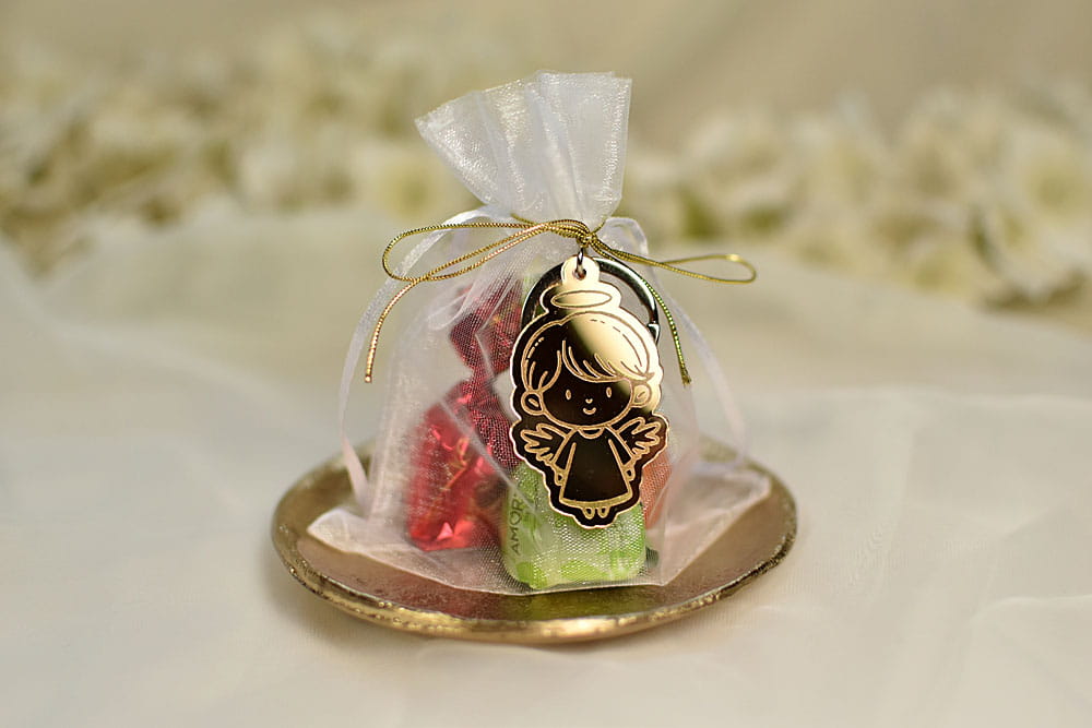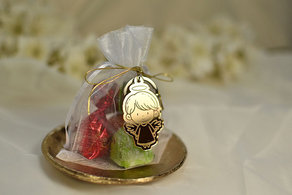pralinki podziękowania dla gości z breloczkiem aniołkiem, złote lustro, na Komunię, Chrzest PR15