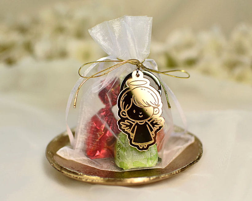 Słodki upominek dla gości - zestaw pralinek w satynowym woreczku z breloczkiem aniołkiem chłopcem z efektem złotego lustra.