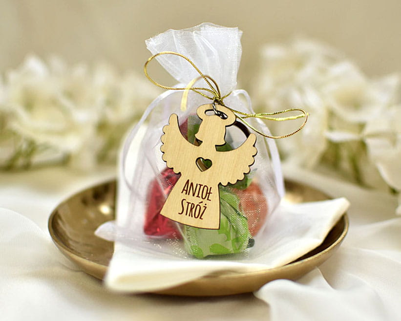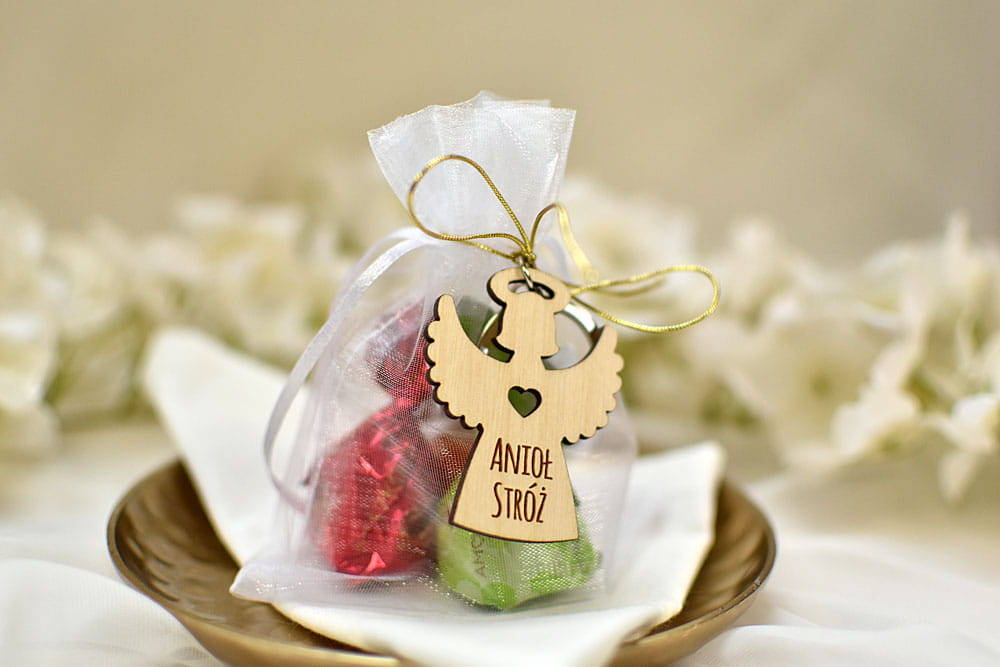 breloczek Anioł Stróż podziękowanie dla gości + pralinki w woreczku PR3