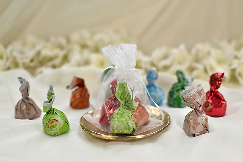 Pomysł na podziękowanie dla gości za przybycie - ozdobny woreczek z organzy wypełniony pralinkami od polskiego producenta. W zależności od wersji do woreczka może być dowiązany personalizowany bilecik z Twoim tekstem, a nawet pamiątkowy breloczek. Na bileciku lub na breloczku może zostać umieszczone imię gościa, dzięki czemu upominek będzie jednocześnie pełnił rolę winietki. Taki elegancki podarunek będzie się świetnie prezentował położony obok talerza.
