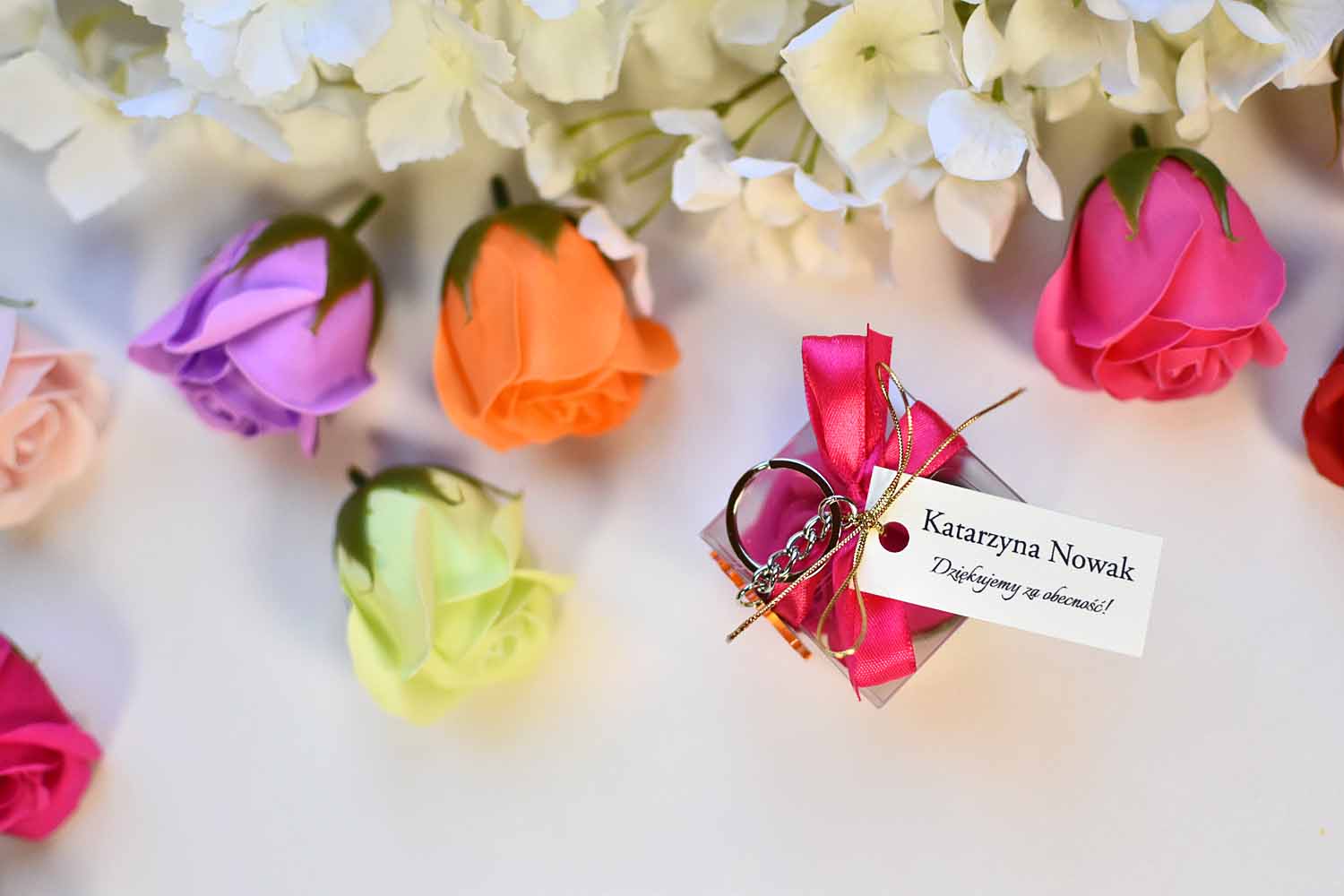 winietka i upominek dla gości na Chrzcie, Komunii, róża mydlana z brelokiem P3
