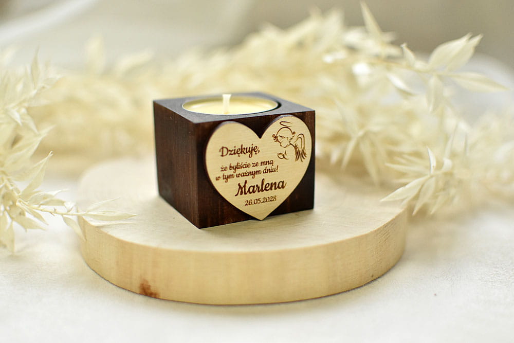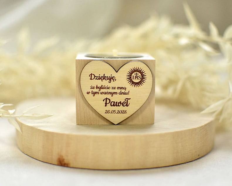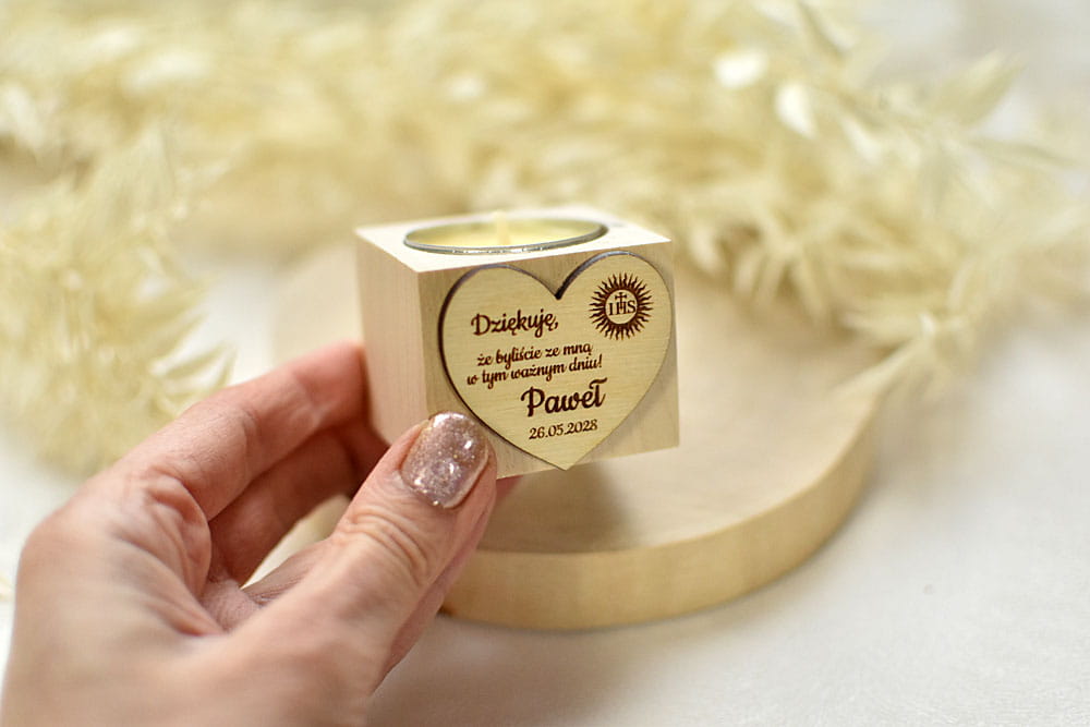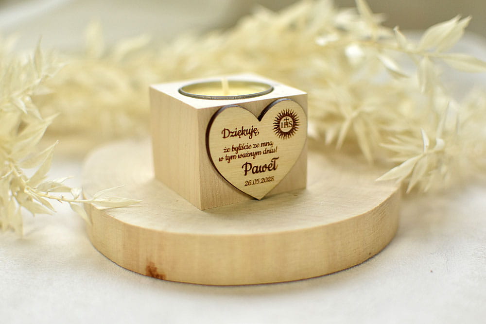 Niecodzienna pamiątka dla gości z okazji Chrztu lub Komunii Świętej - przepiękny drewniany świecznik ozdobionym grawerowanym serduszkiem. Dopełnieniem całej kompozycji jest pachnąca świeczka - wkład tealight wykonany przez nas z wosku sojowego. Świecznik jest wspaniałym ekologicznym prezentem, który przez długie lata będzie cieszyć gości. Po wypaleniu się świeczki można włożyć następny standardowy podgrzewacz.