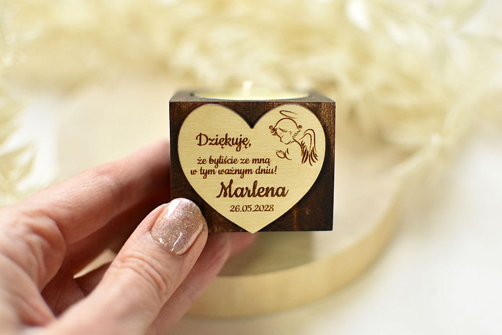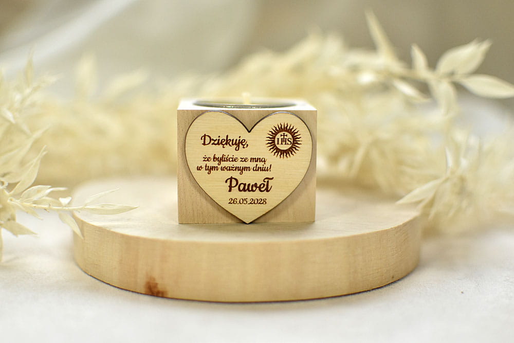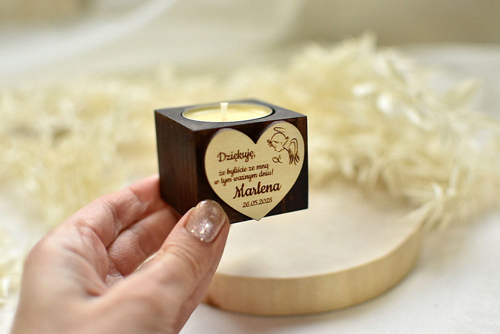 Niecodzienna pamiątka dla gości z okazji Chrztu lub Komunii Świętej - przepiękny drewniany świecznik ozdobionym grawerowanym serduszkiem. Dopełnieniem całej kompozycji jest pachnąca świeczka - wkład tealight wykonany przez nas z wosku sojowego. Świecznik jest wspaniałym ekologicznym prezentem, który przez długie lata będzie cieszyć gości. Po wypaleniu się świeczki można włożyć następny standardowy podgrzewacz.