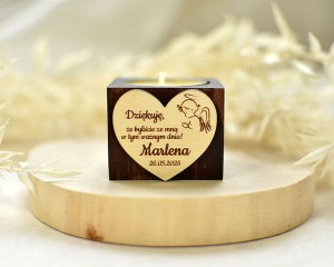 Zestaw prezentowy - drewniany świecznik z pachnącym wkładem tealight i ozdobą z serduszka z tekstem + woreczek.