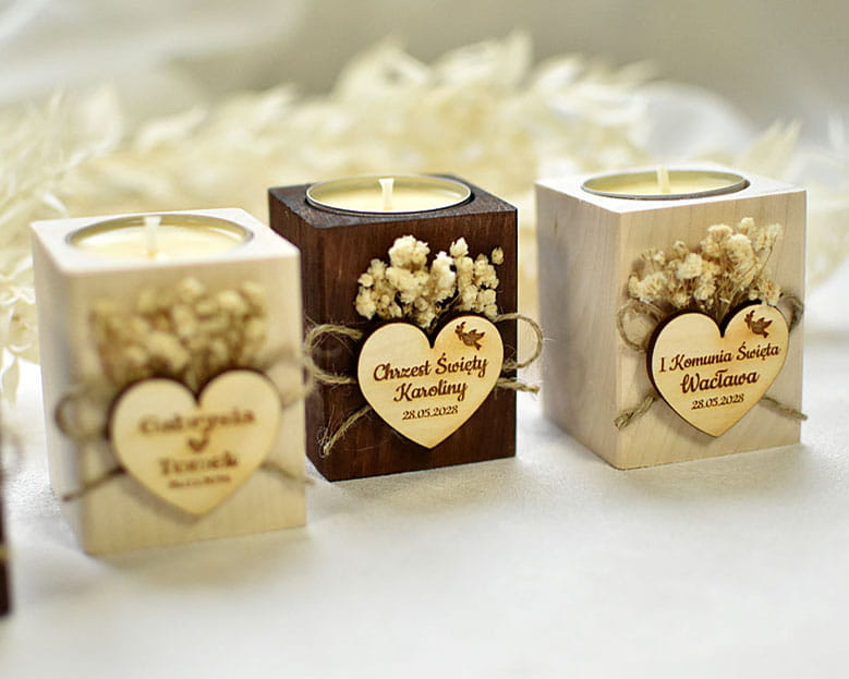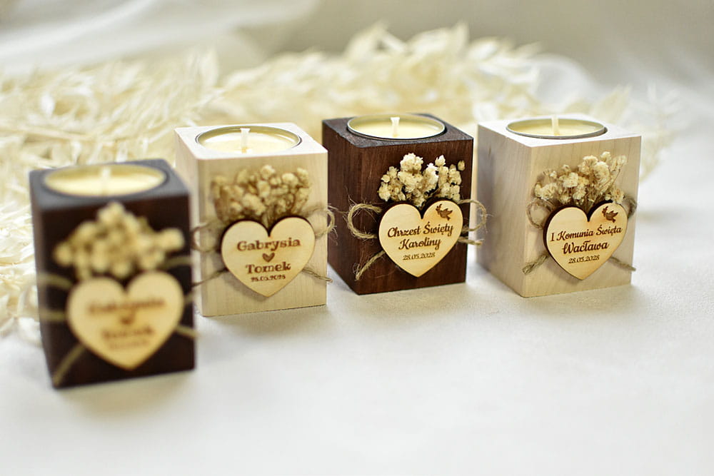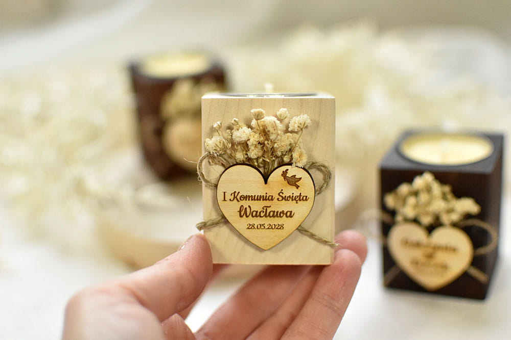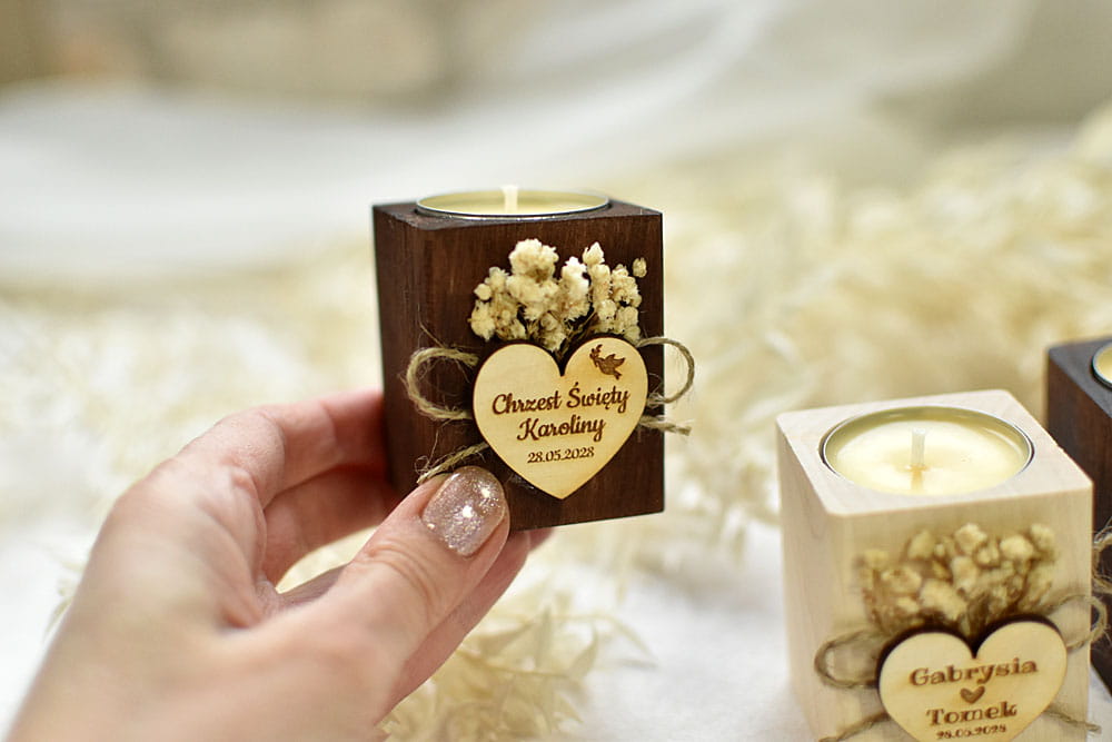 Niecodzienna pamiątka dla gości z okazji Chrztu lub Komunii Świętej - przepiękny drewniany świecznik w stylu rustykalnym. Świecznik jest ozdobiony suszonymi kwiatami gipsówki oraz serduszkiem z wygrawerowanym napisem nawiązującym do Waszej uroczystości. Dopełnieniem całej kompozycji jest pachnąca świeczka - wkład tealight wykonany przez nas z wosku sojowego. Świecznik jest pięknym ekologicznym prezentem, który przez długie lata będzie cieszyć gości. Po wypaleniu się świeczki można włożyć następny standardowy podgrzewacz.