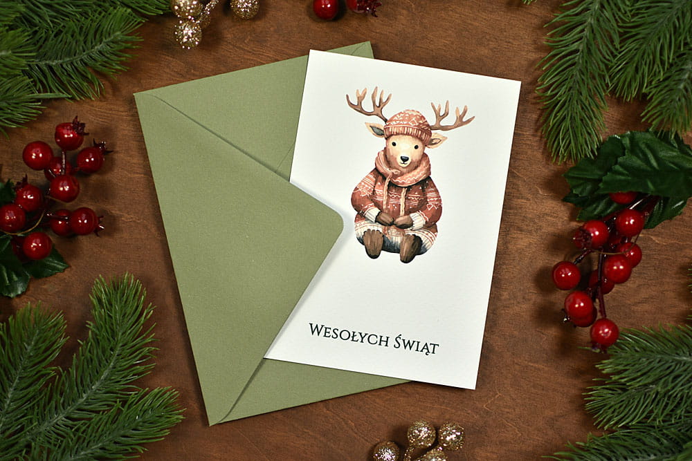 Bardzo klimatyczny zestaw świątecznych, bożonarodzeniowych kartek, ozdobionych motywami pierników, jemioły, reniferów czy choinek. Kartki można spersonalizować, można podać własny tekst, a nawet dodać logo. Dopełnieniem zestawu są wykonane z papieru ekologicznego koperty w kolorze zielonym.