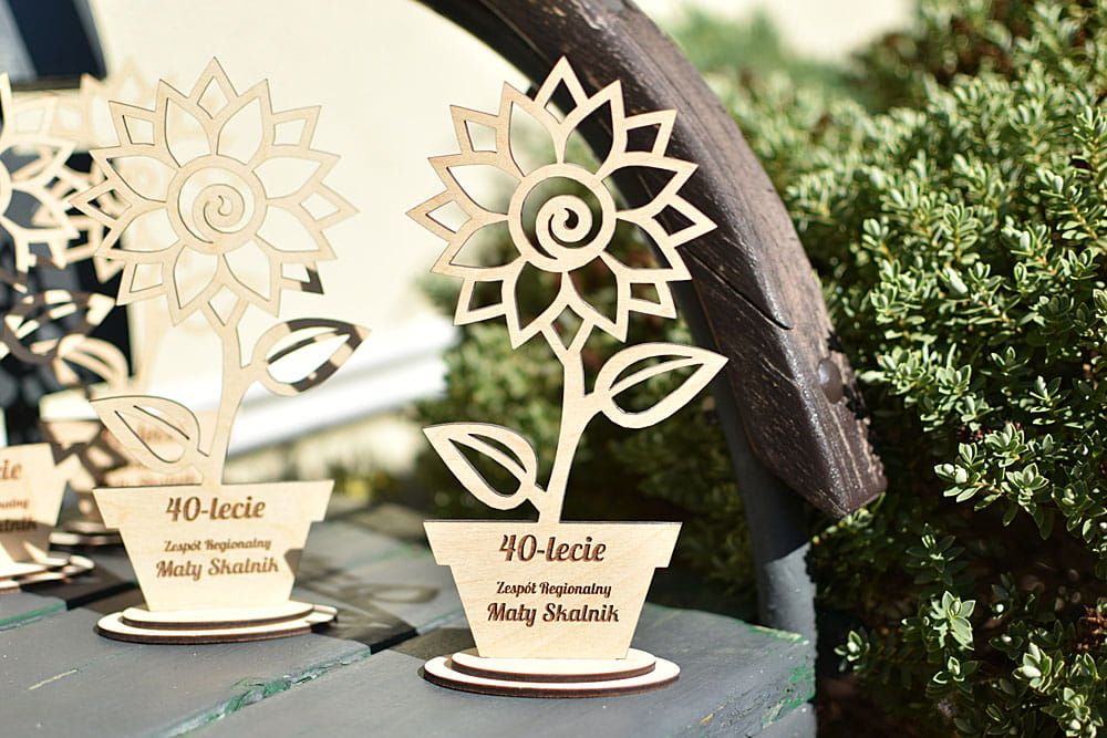 Drewniana statuetka w kształcie kwiatu słonecznika - pomysł na fajny eko prezent z Waszym napisem. Taki kwiat na pewno nie zwiędnie i będzie sympatyczną pamiątką na długie lata. Wygrawerowane teksty można dowolnie modyfikować.