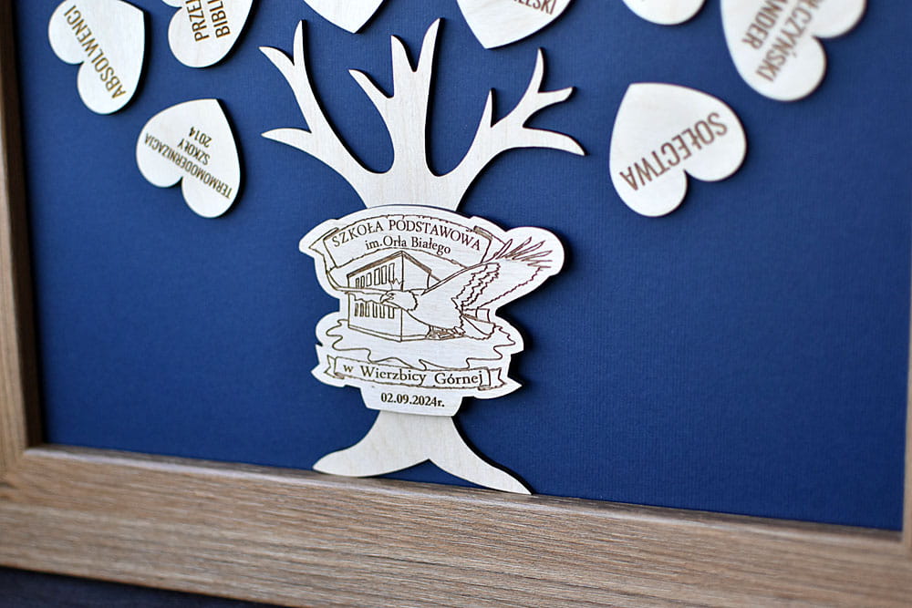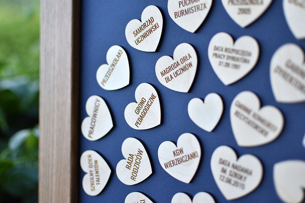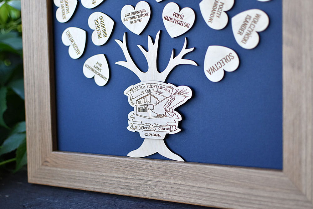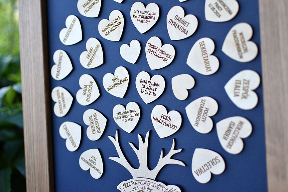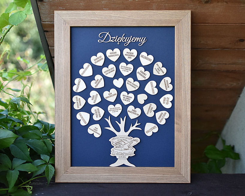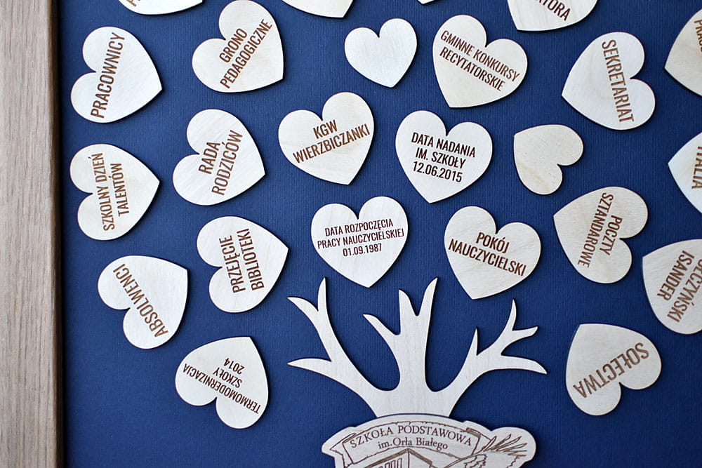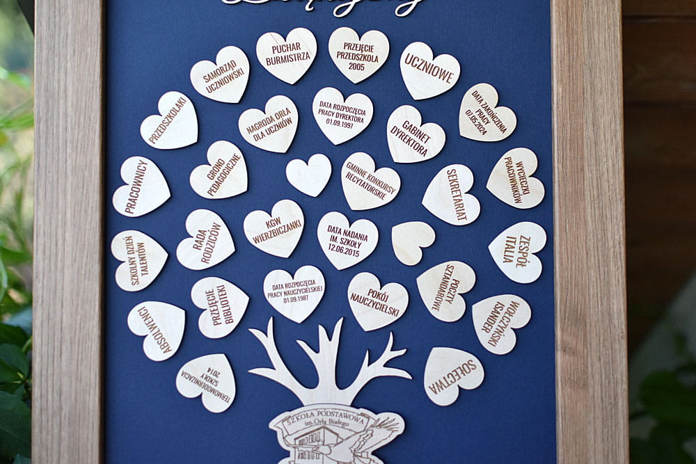 Napis górny oraz napisy na sercach są dowolne. W przypadku drzewka zaprezentowanego na zdjęciach na ok. 27 serduszkach znajdują się wygrawerowane przeróżne teksty ważne dla obdarowywanej osoby.