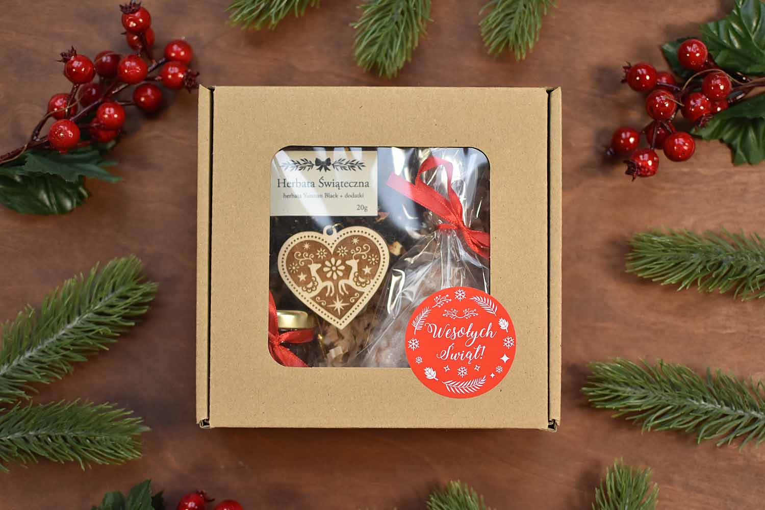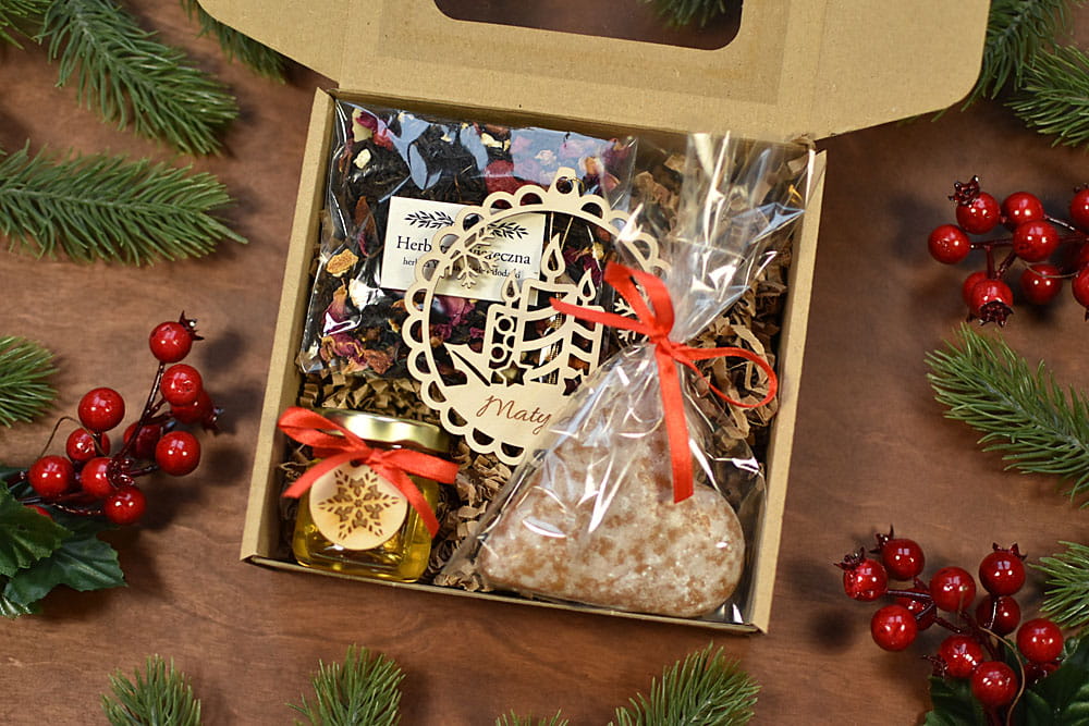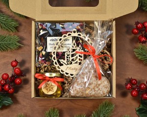 PAKOWANIE + PUDEŁKO: upominki są zapakowane w ekologiczne pudełko, na wieczku jest przyklejona naklejka z napisem "Wesołych Świąt", całość jest gotowa do wręczenia