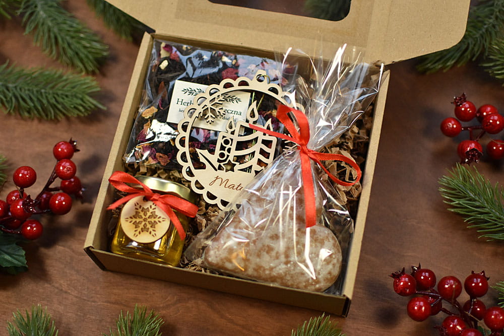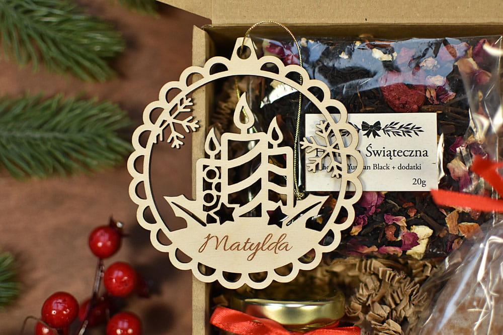 Zestaw upominkowy na święta z personalizowaną bombką, piernikiem, herbatą zimową i miodem, całość pięknie zapakowana w eko pudełko.