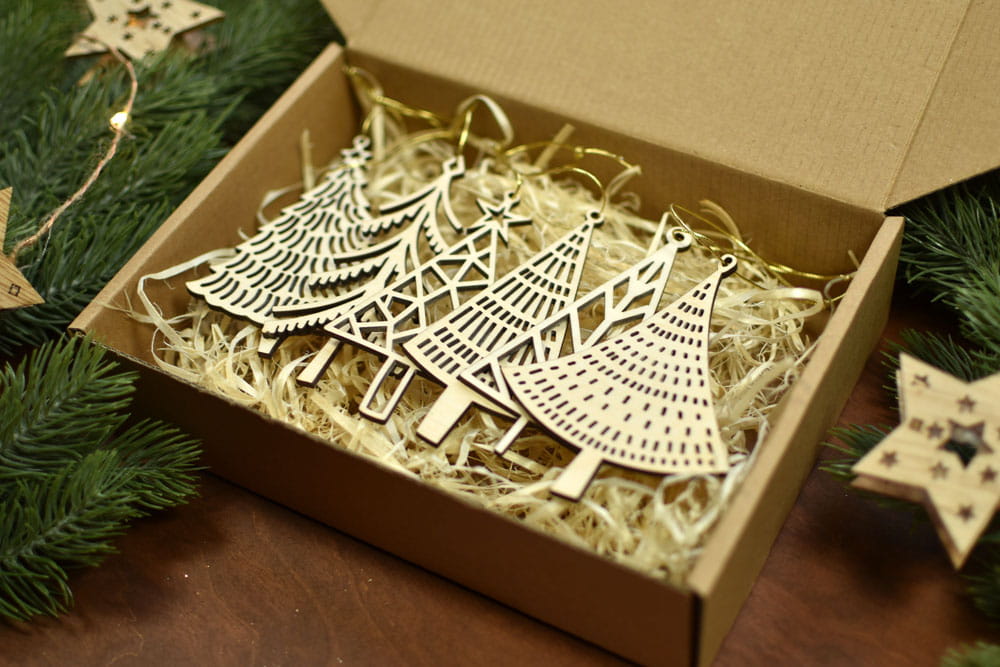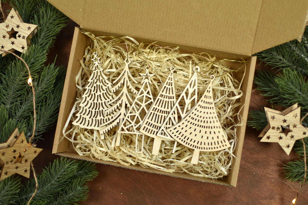Pomysł na świąteczny prezent dla Waszych klientów - zestaw 6 szt. drewnianych zawieszek w kształcie choinek. Zapakowane w ekologiczne pudełko zawieszki będą pięknym prezentem dla obdarowanych. Jest możliwość zamówienia zawieszek osobno, bez pudełka. Zawieszki mogą służyć także jako dodatek do bożonarodzeniowych boksów.