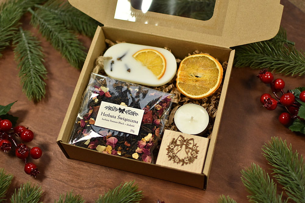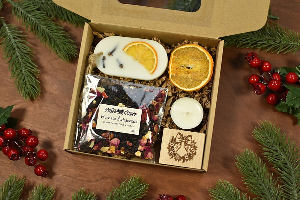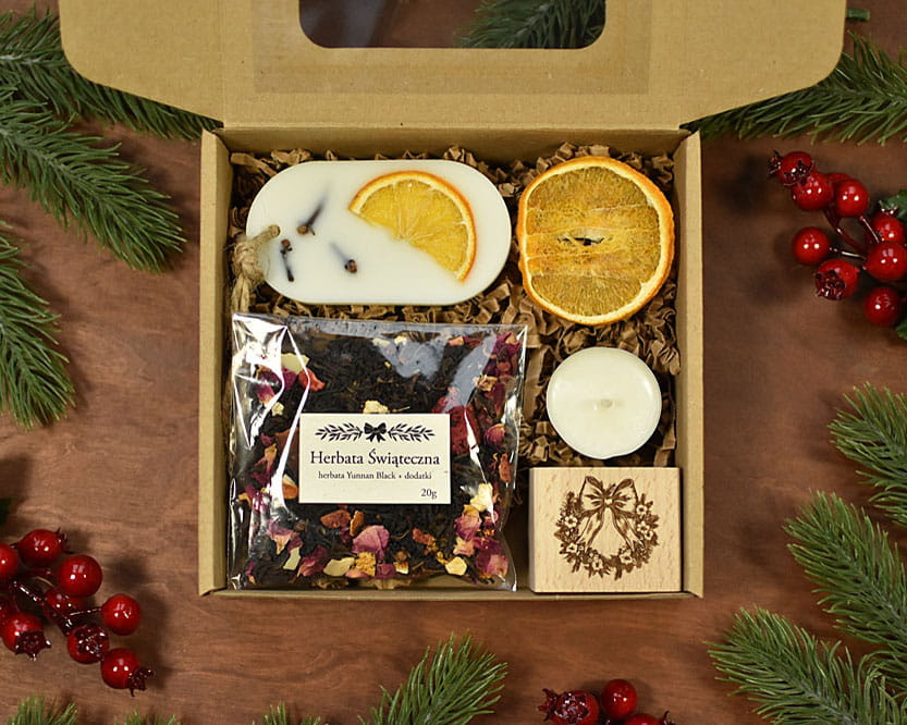 Zestaw prezentowy na Boże Narodzenie z herbatą wigilijną, pachnącą świętami zawieszką sojową oraz grawerowanym świecznikiem, całość pięknie zapakowana w eko pudełko.