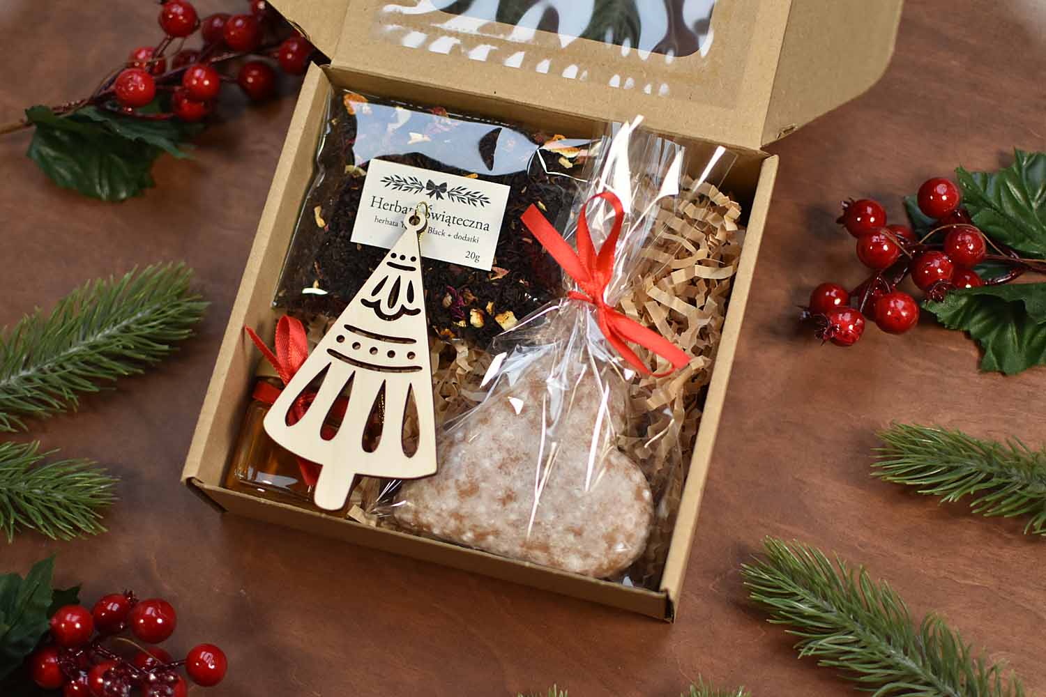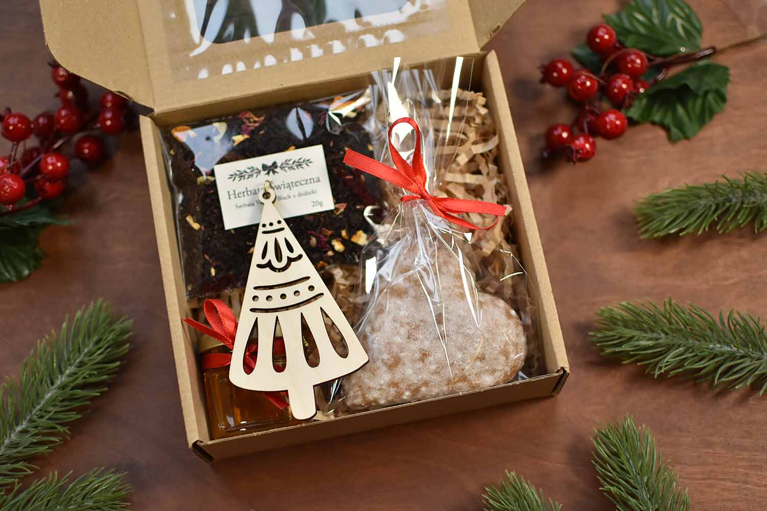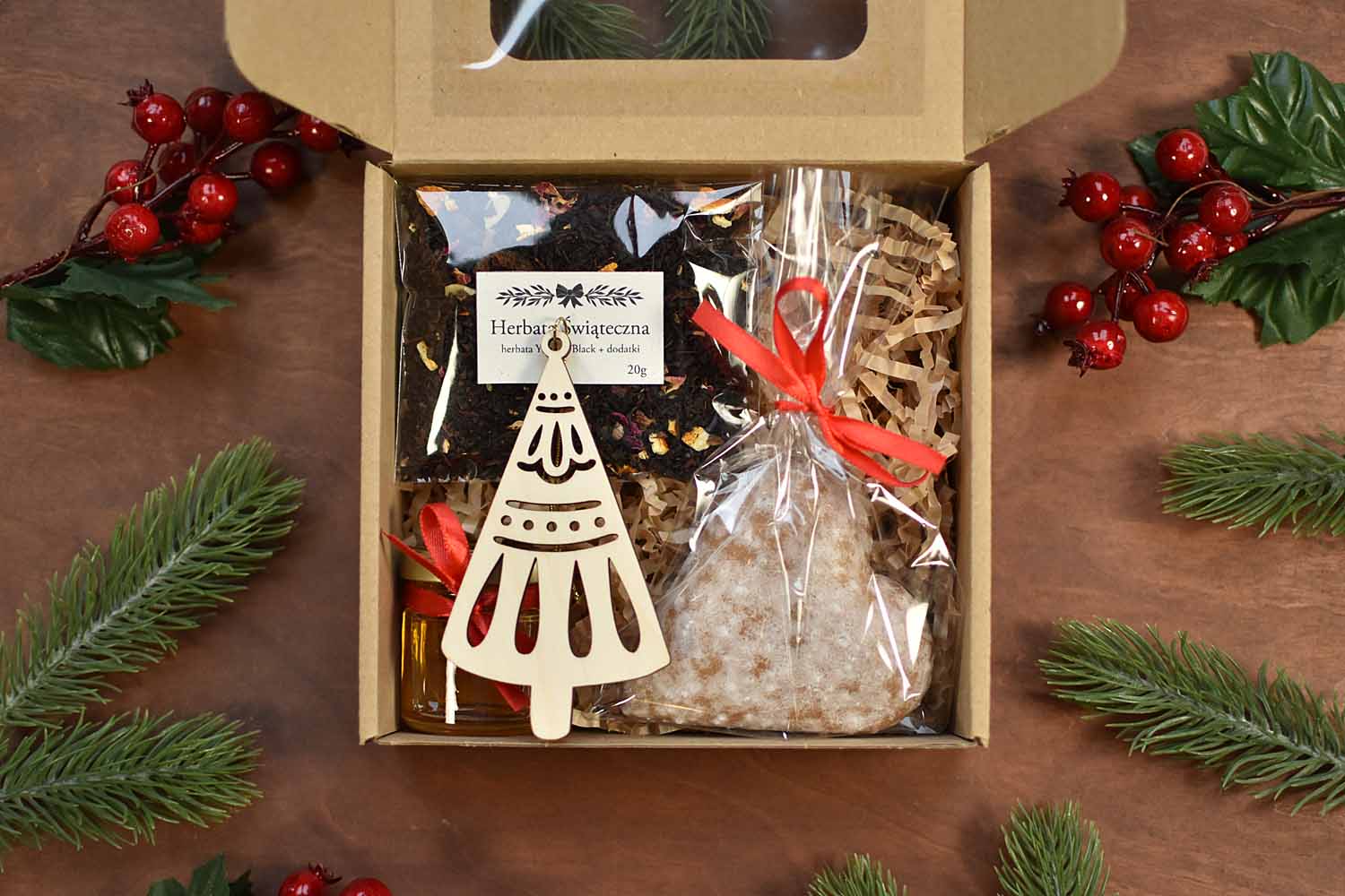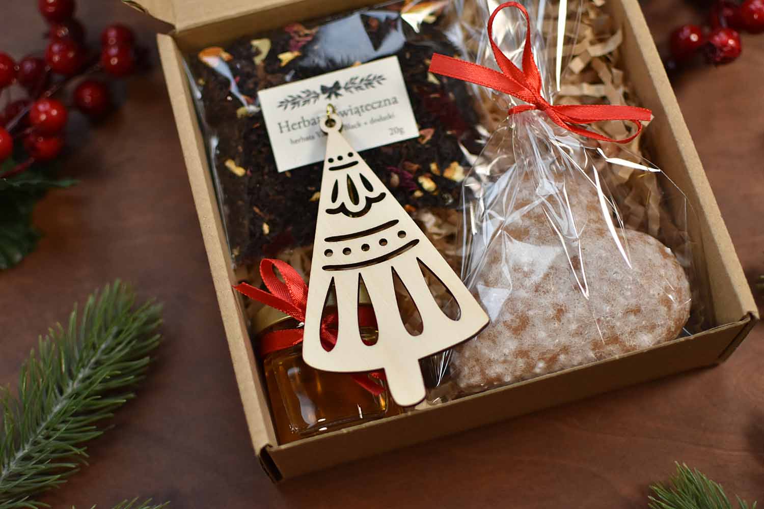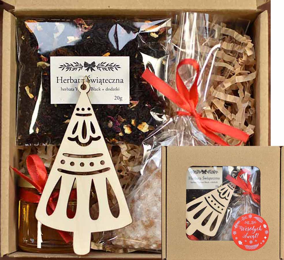 Zestaw upominkowy na święta z zawieszką choinką, piernikiem, herbatą zimową i miodem, całość pięknie zapakowana w eko pudełko.