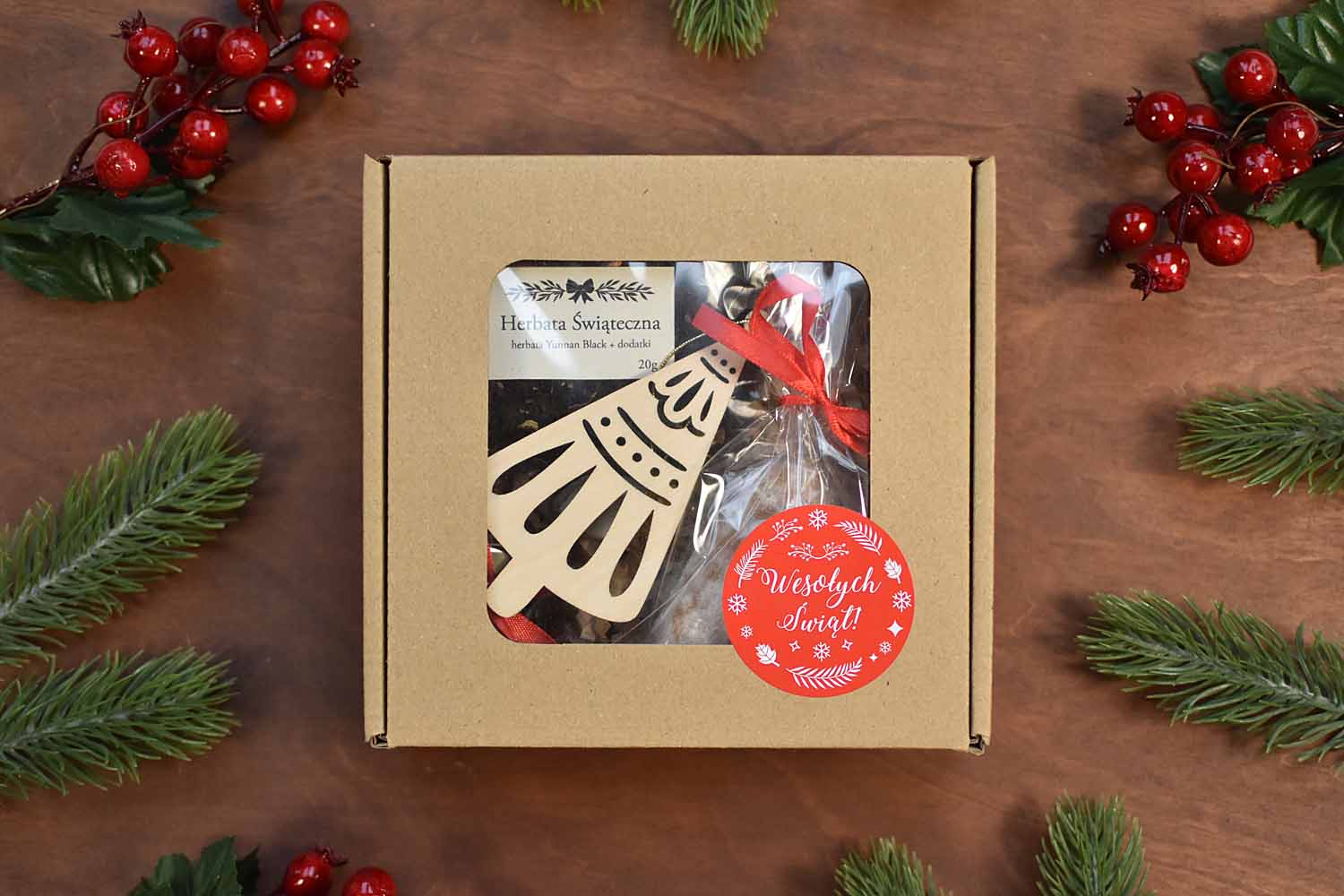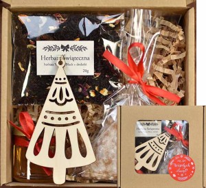 PAKOWANIE + PUDEŁKO: upominki są zapakowane w ekologiczne pudełko, na wieczku jest przyklejona naklejka z napisem "Wesołych Świąt", całość jest gotowa do wręczenia