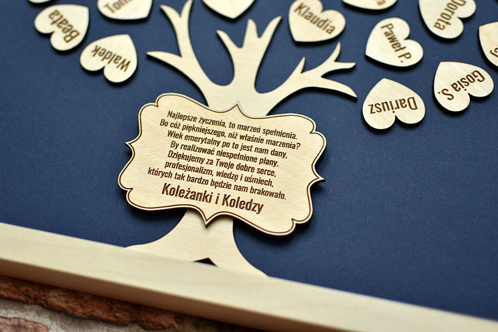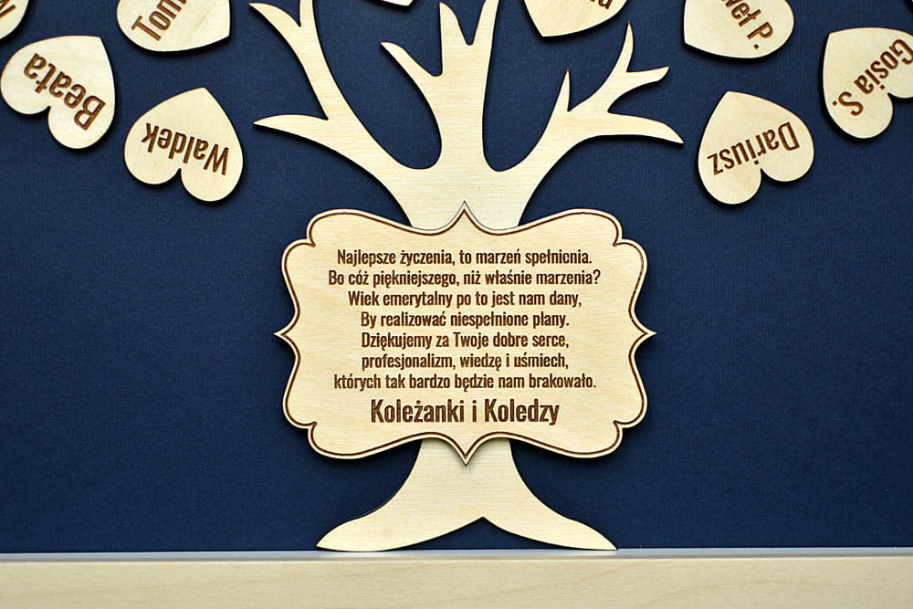 Napis górny oraz napisy na sercach są dowolne. W przypadku drzewka zaprezentowanego na zdjęciach na ok. 45 serduszkach znajdują się wygrawerowane imiona współpracowników.
