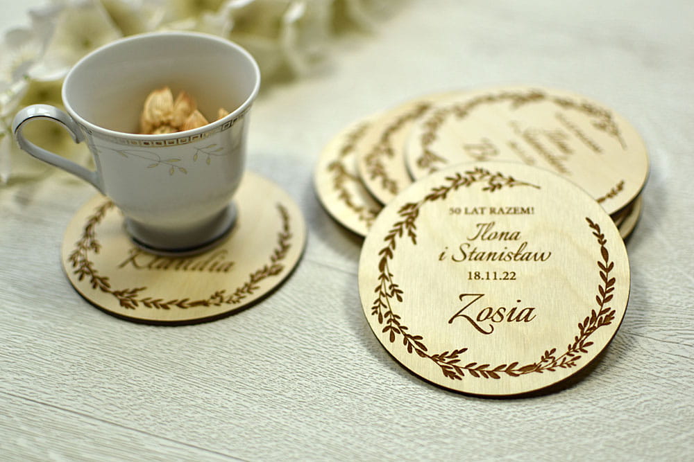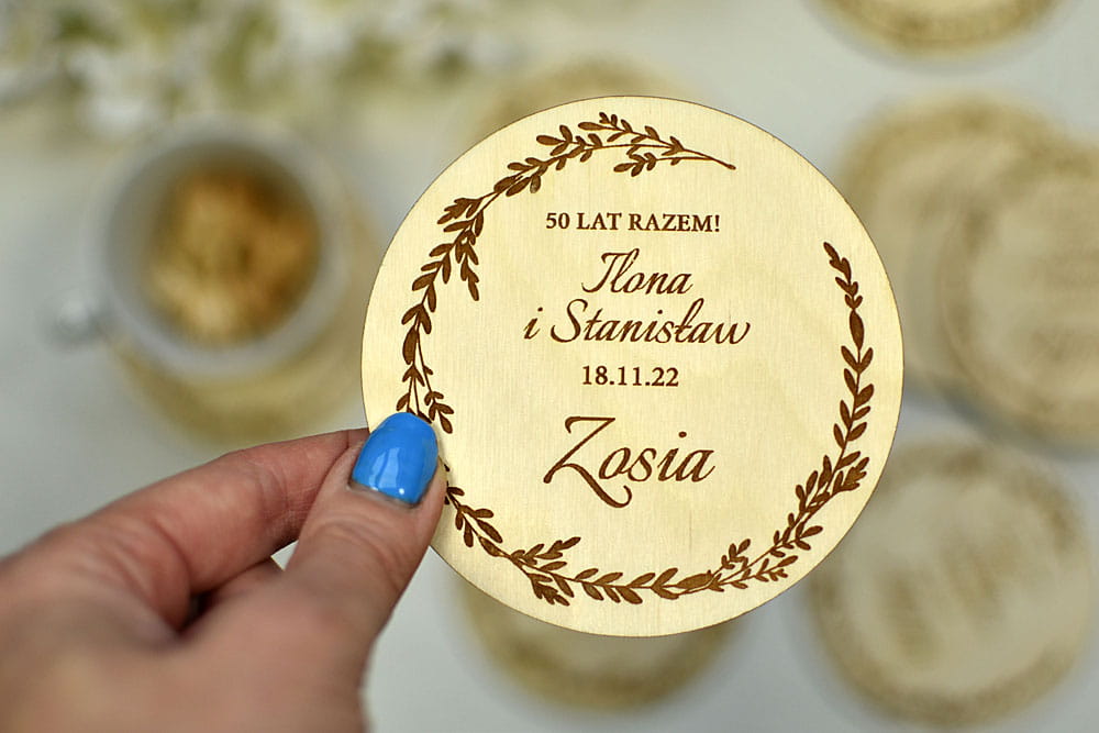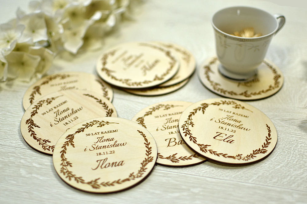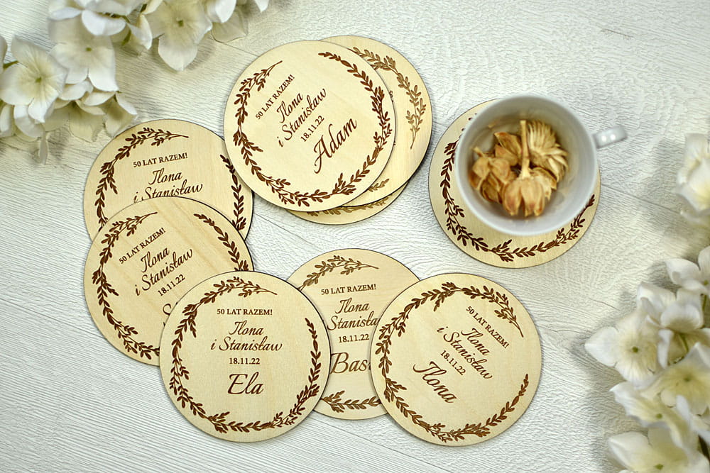 Polecamy upominki dla Waszych gości z okazji 50 rocznicy ślubu - podkładki pod kubek/filiżankę/kieliszek z wygrawerowanym imieniem gościa.