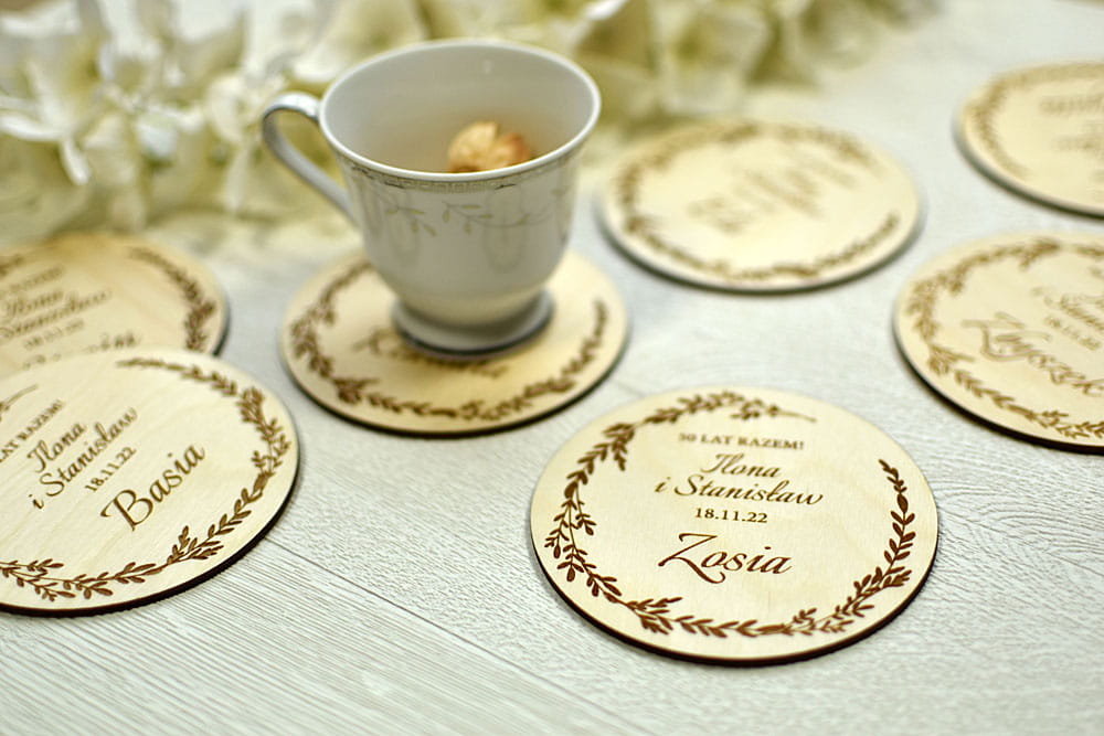 Drobny prezent dla gości z okazji Złotych Godów - drewniana podkładka pod kubek.