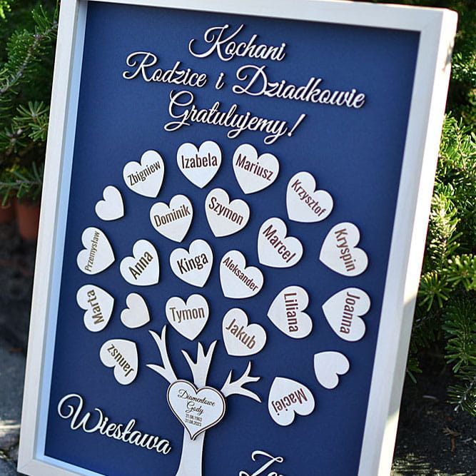 Prezent dla rodziców lub dziadków z okazji 60-tej rocznicy ślubu - drzewko z imionami dzieci, wnuków, prawnuków.
