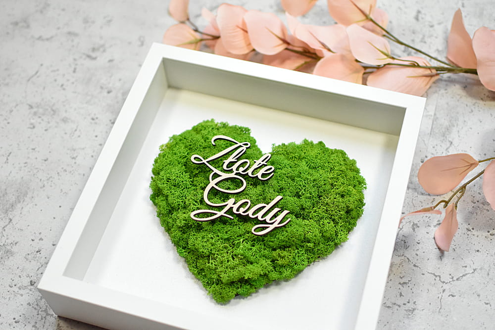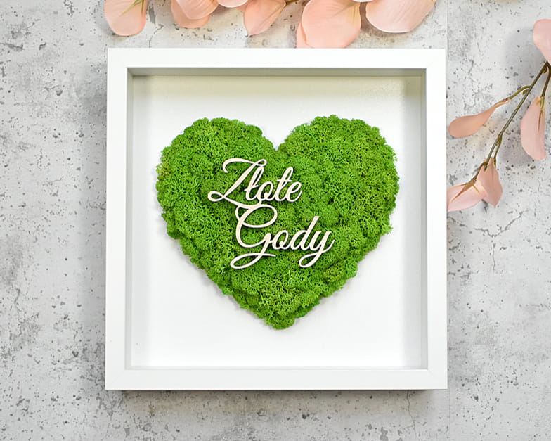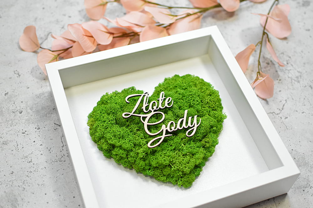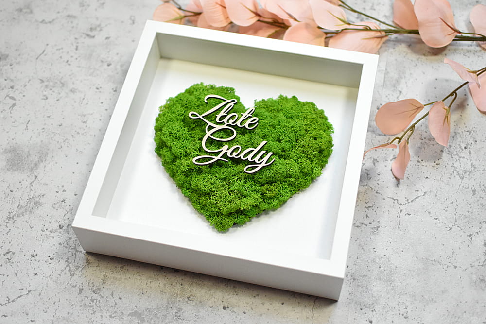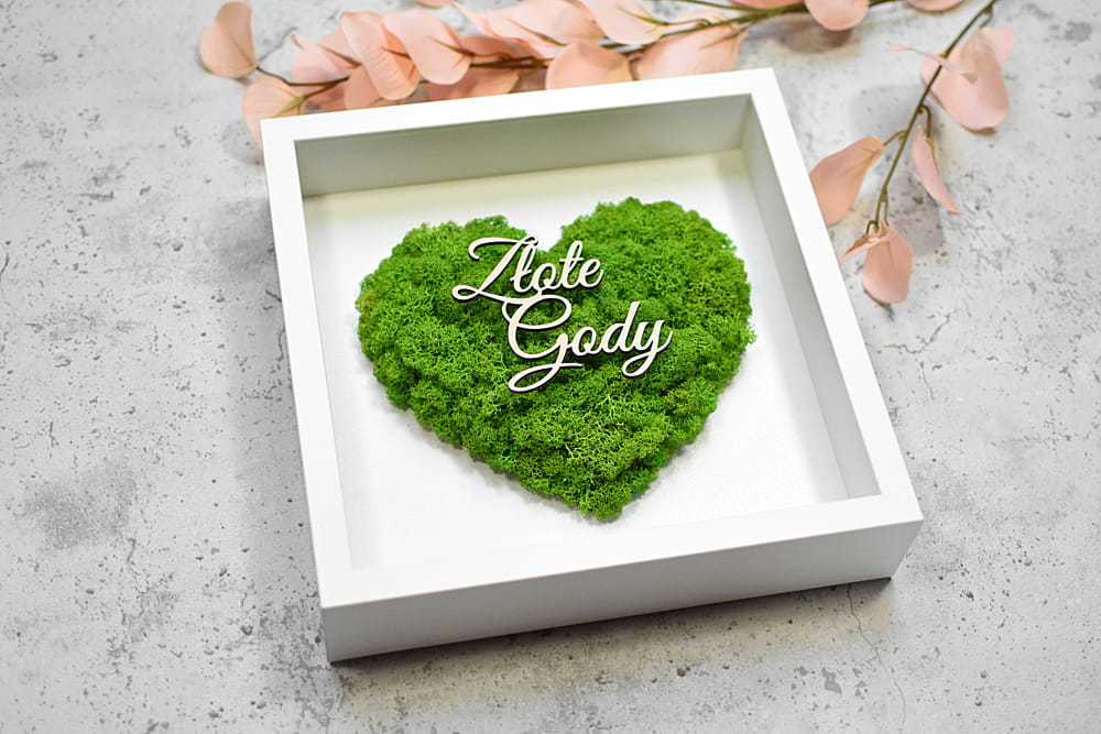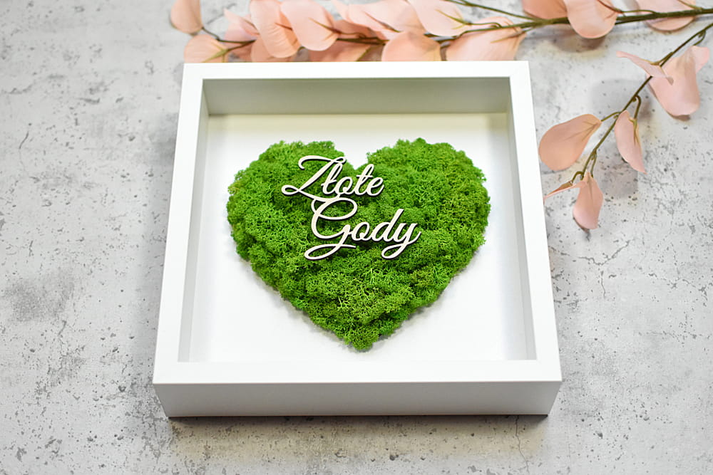 elegancki prezent na 50 rocznicę ślubu Złote Gody, obraz serce z mchu z Twoim napisem