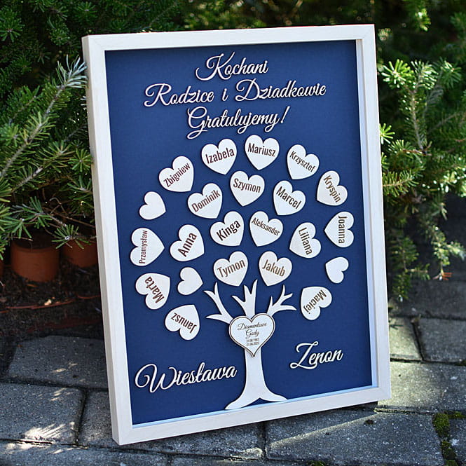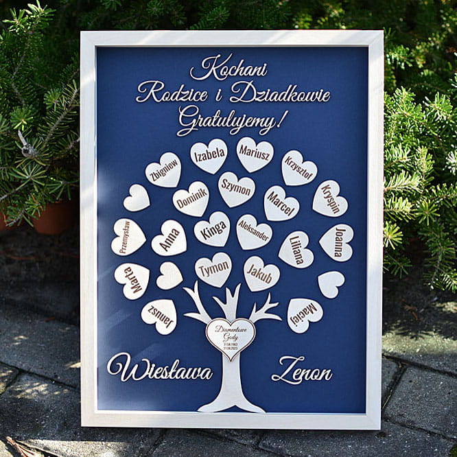 Elegancki prezent na 60 lecie ślubu Rodziców i Dziadków - obraz drzewko z imionami dzieci i wnuków.