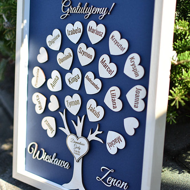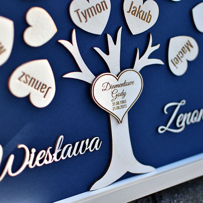 Szukasz prezentu na 60 rocznicę ślubu lub pamiątki na Diamentowe Gody dla rodziców lub dziadków? Polecamy przepiękny obraz 3D do powieszenia na ścianie, który jednocześnie będzie wspaniałym prezentem. Na poszczególnych serduszka znajdują się wygrawerowane imiona członków rodziny. Liczba serc jest do uzgodnienia. Ten niepowtarzalny obraz może być wykorzystany przy dowolnej uroczystości jak urodziny, jubileusz, zakończenie szkoły, pracy itp., a serduszka mogą zostać przez Was także ręcznie odpowiednio opisane.