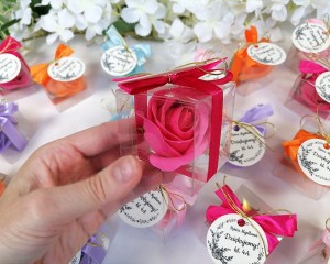 Śliczny prezent z okazji Dnia Nauczyciela lub zakończenia roku szkolnego - róża z pachnącymi, mydlanymi płatkami, które dodaje się do kąpieli. Róża jest zapakowana w transparentne pudełeczko, dodatkowo przewiązane ozdobną tasiemką. Całość jest gotowa do wręczenia.