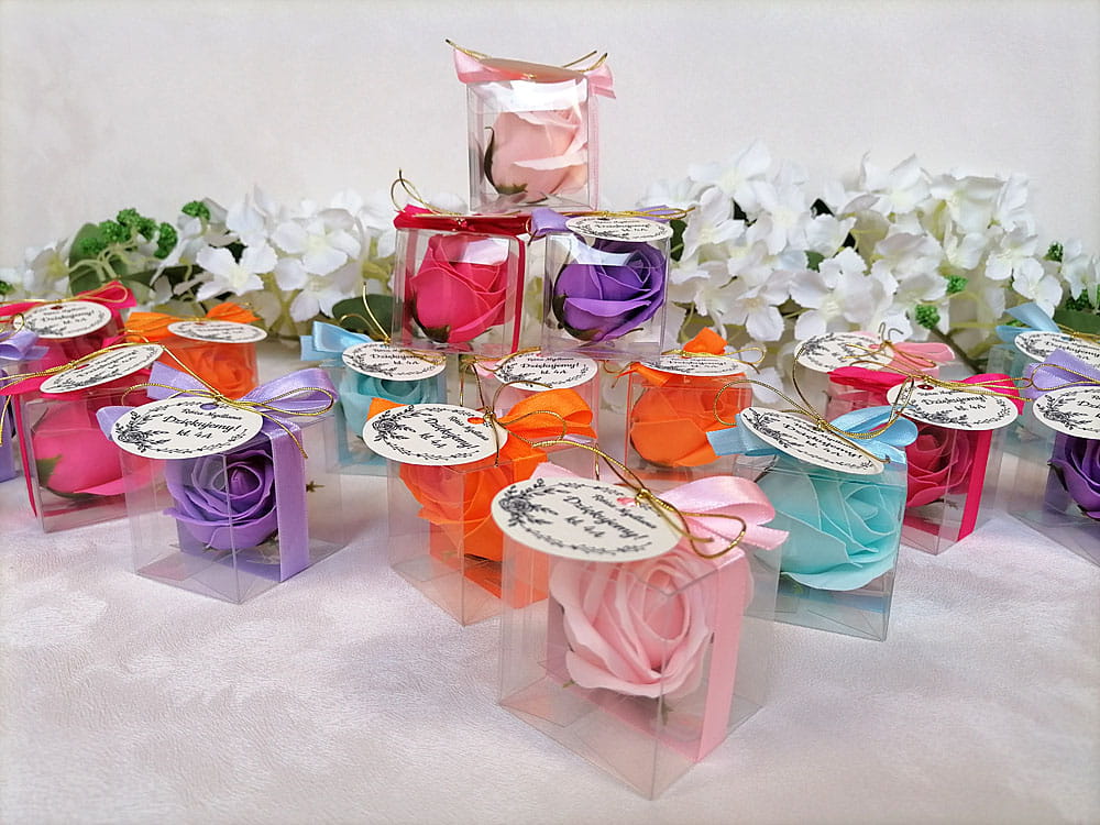 Drobny upominek dla Nauczyciela - pachnąca róża mydlana mix kolorów w pudełeczku z bilecikiem, gotowa do wręczenia.