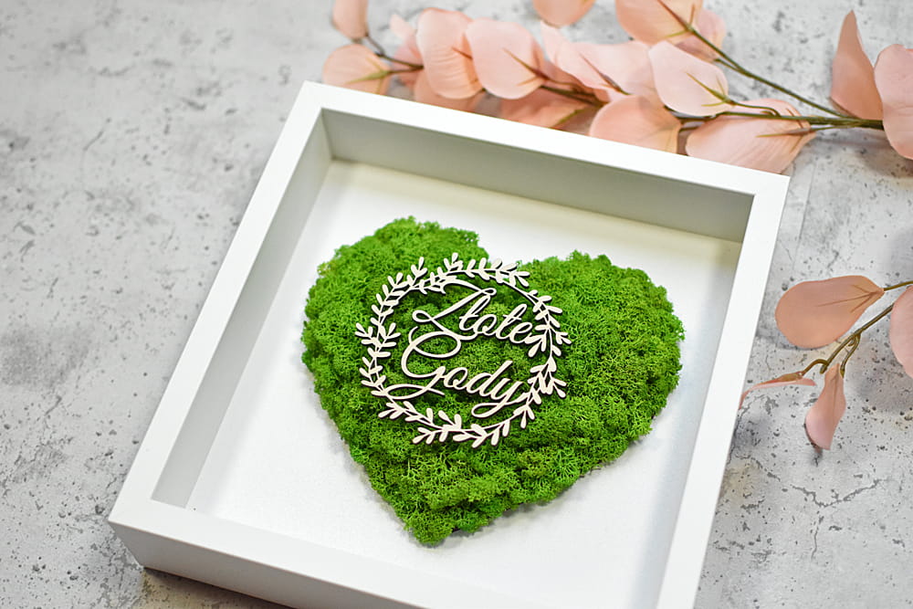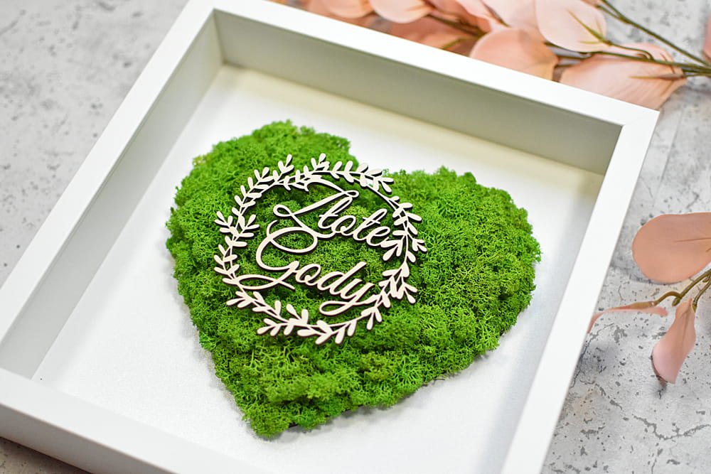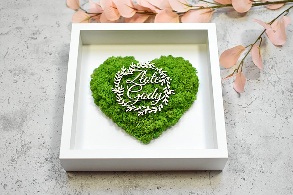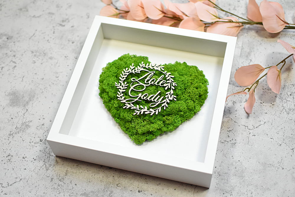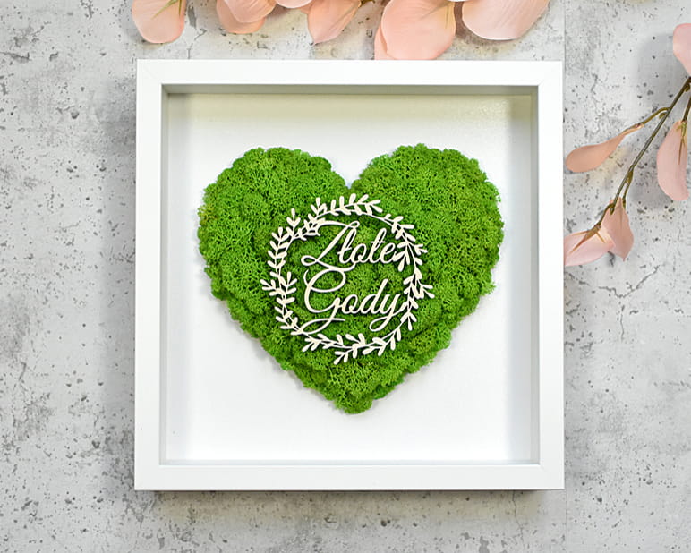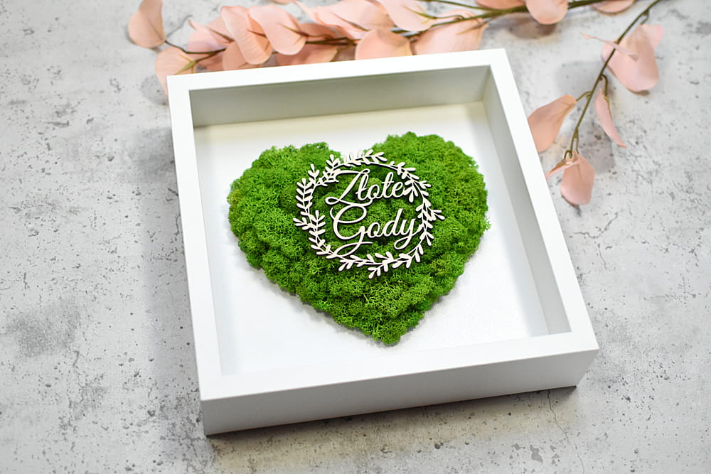 Piękny, elegancki i przestrzenny obraz ozdobiony sercem z naturalnego mchu chrobotka ze Skandynawii. Idealny na prezent dla rodziców, dziadków, przyjaciół na 50-lecie ślubu. Na zdjęciach znajduje się przykładowy napis, ale jest możliwość umieszczenia innego napisu i dostosowania obrazu do innej okazji. Obraz można powiesić na ścianie lub postawić na biurku dzięki bardzo głębokiej ramce, z tyłu także znajduje się rozkładana nóżka.