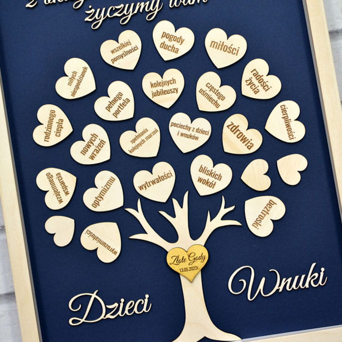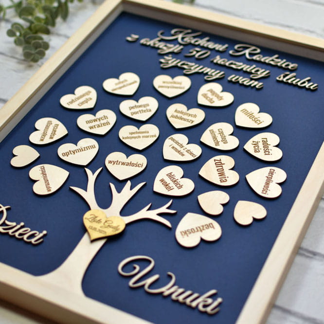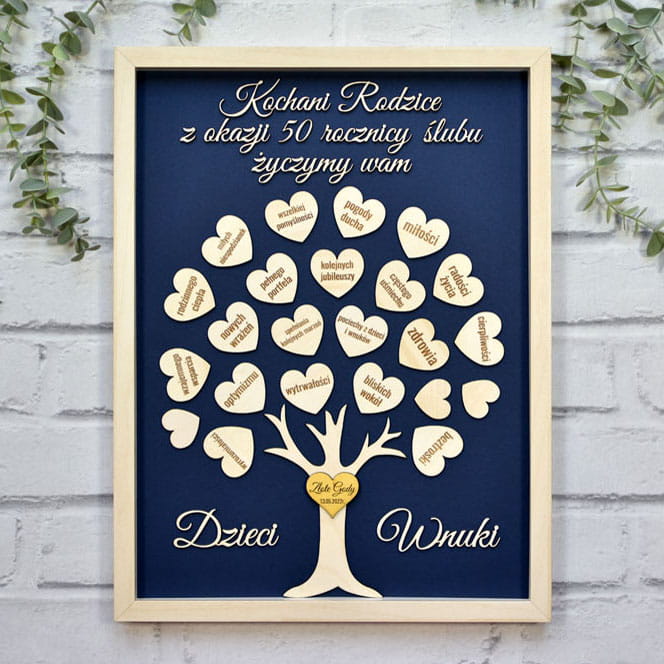 Prezent na 50 rocznicę ślubu - obraz drzewko z życzeniami od dzieci i wnuków.