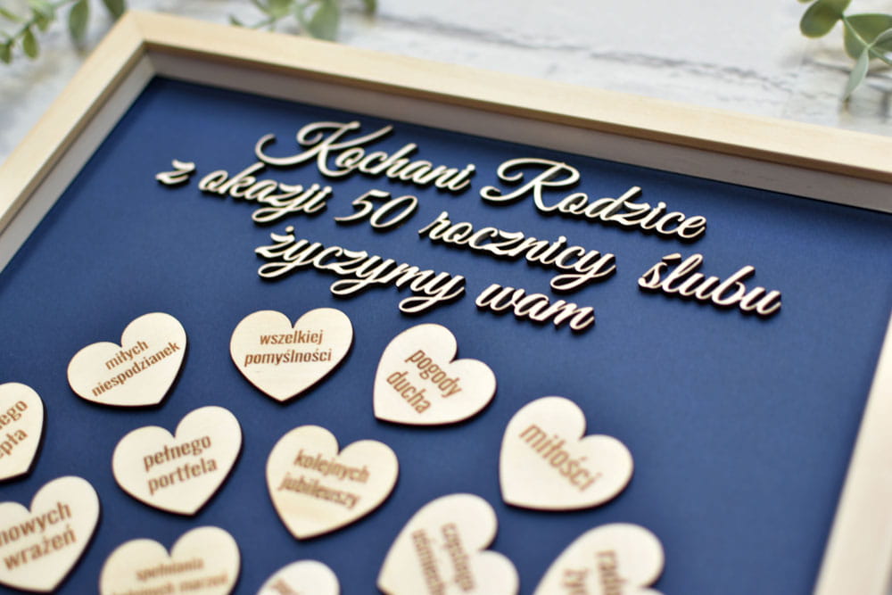 Szukasz oryginalnego prezentu na Złote Gody dla rodziców lub dziadków? Polecamy przepiękny obraz 3D do powieszenia na ścianie, idealny na prezent z okazji Srebrnych Godów, 50-lecia ślubu, Rubinowych Godów itp.. Poszczególne serduszka mają wygrawerowane napisy takie jak zdrowia, optymizmu, miłości - czyli wszystko, co chcielibyście życzyć bliskim Wam osobom. Ten niepowtarzalny obraz może być wykorzystany przy dowolnej uroczystości jak urodziny, jubileusz, zakończenie szkoły, pracy itp.