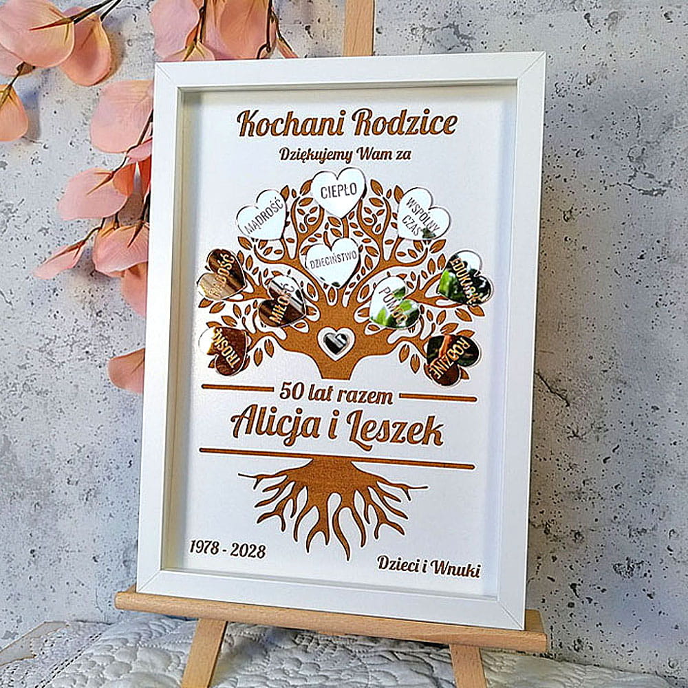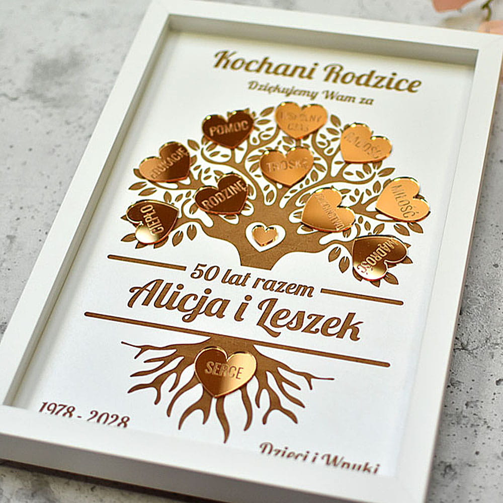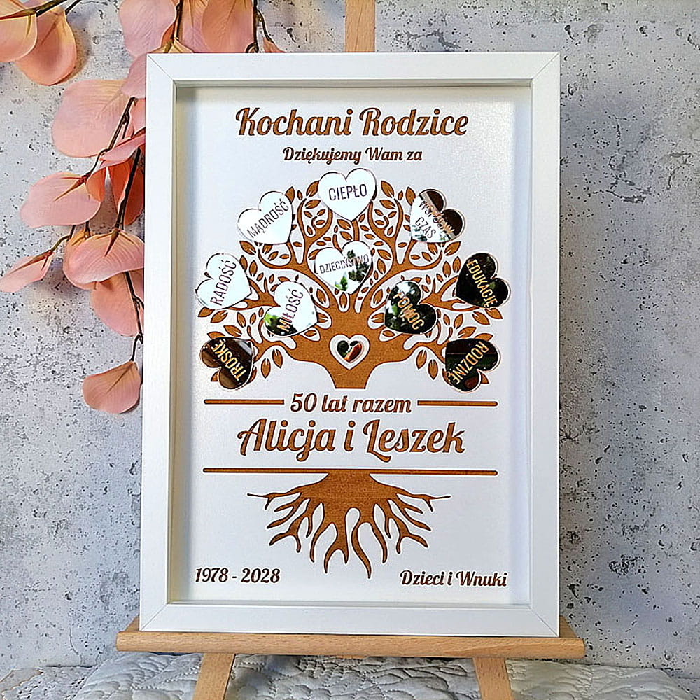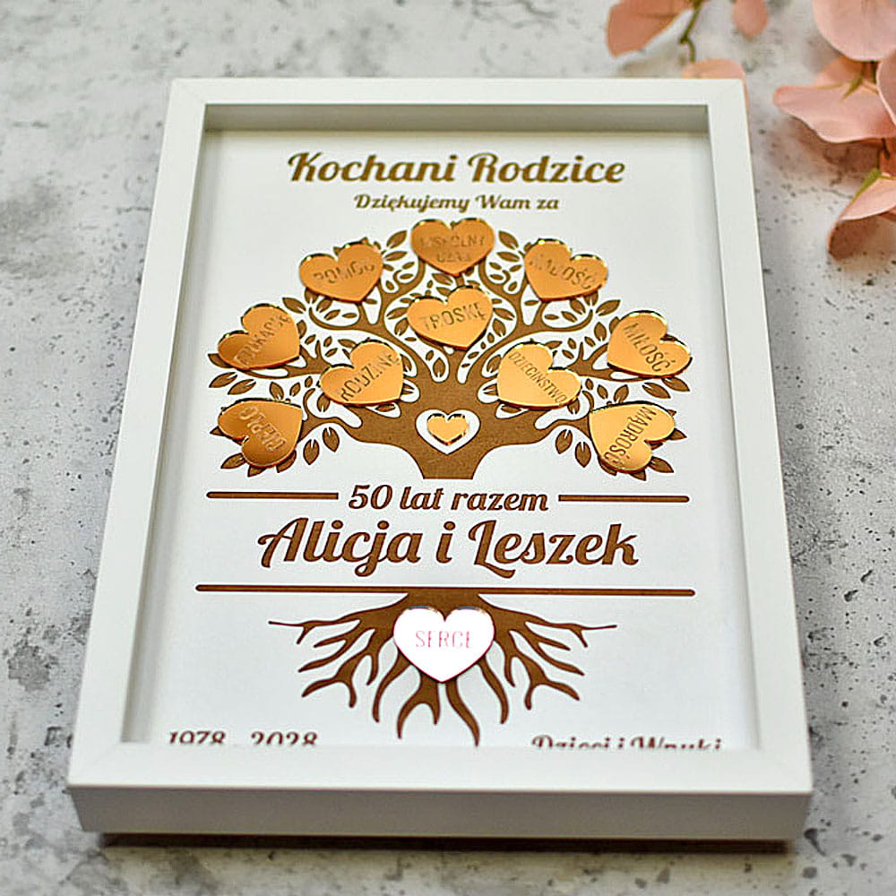 prezent na Diamentowe Gody dla Rodziców, drzewko ze złotymi serduszkami i podziękowaniem ZG4