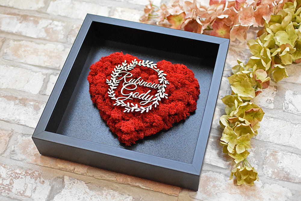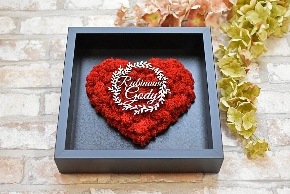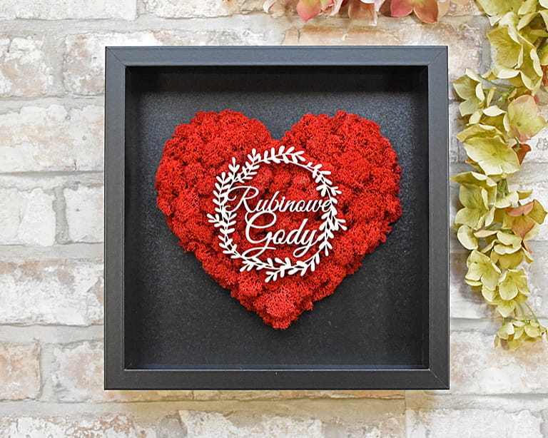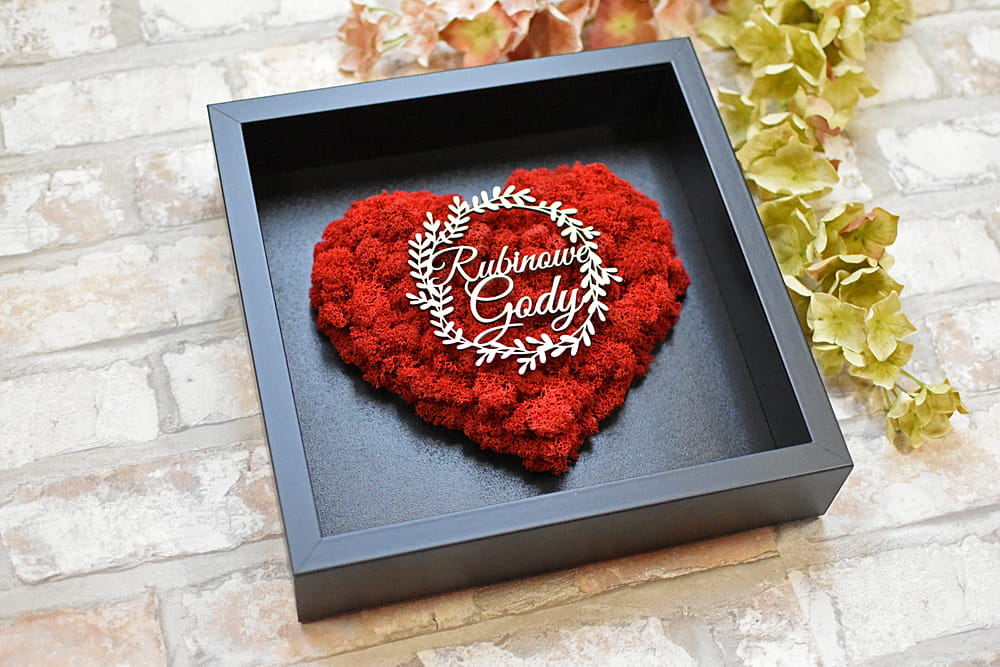 Elegancki prezent na 40 lecie pożycia małżeńskiego - obraz z czerwonym sercem z naturalnego mchu chrobotka.