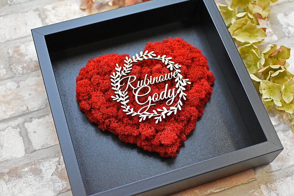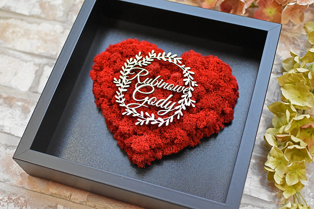 Rubinowe Gody, elegancki prezent na 40 rocznicę ślubu rodziców, dziadków, obraz serce z mchu