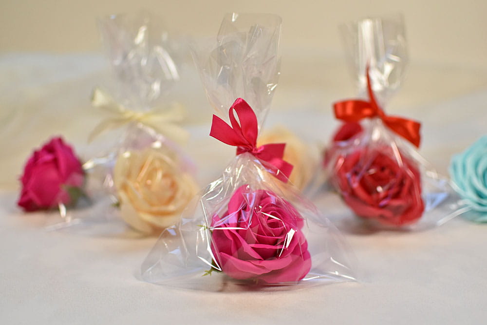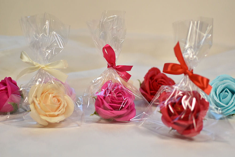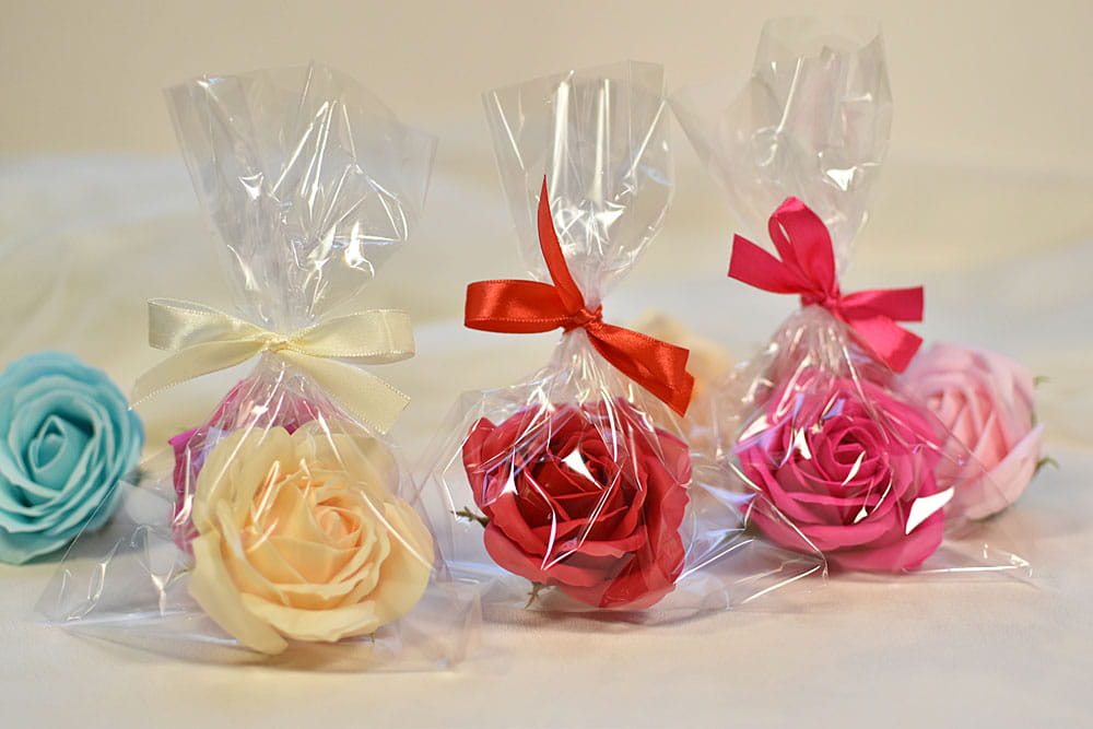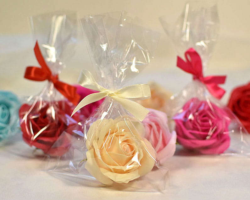 Upominek z okazji Dnia Kobiet - duża róża mydlana zapakowana w woreczek celofanowy na prezent.