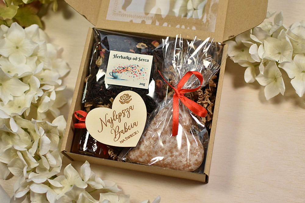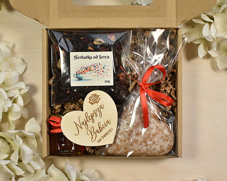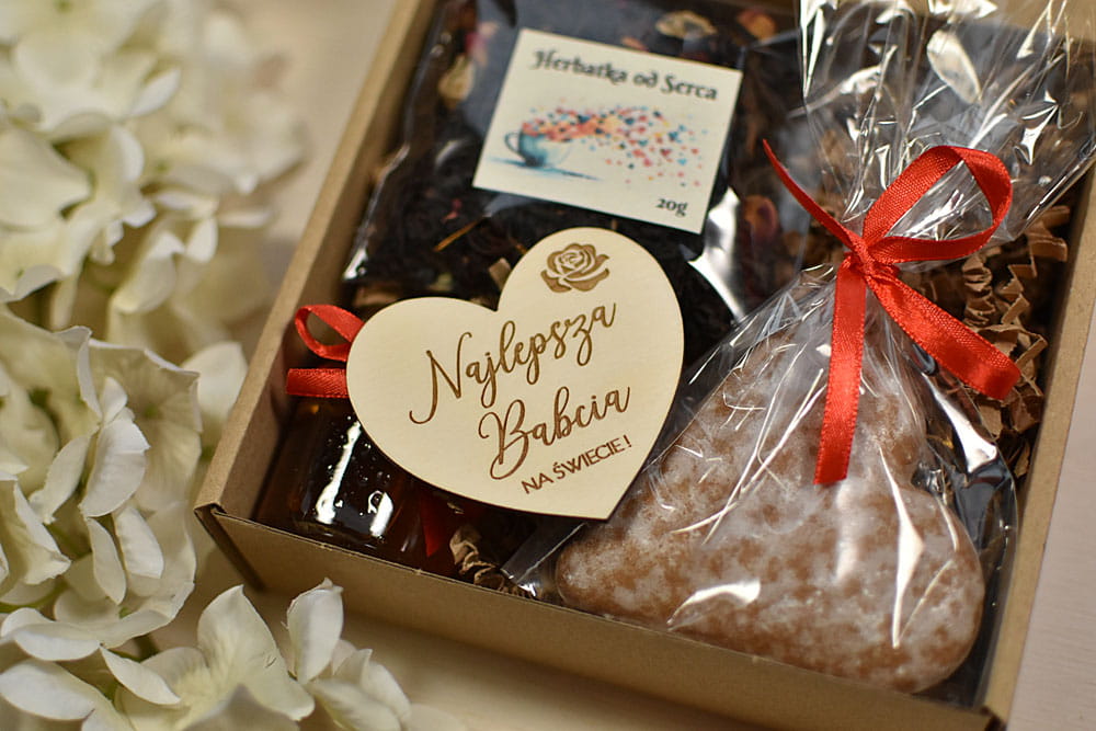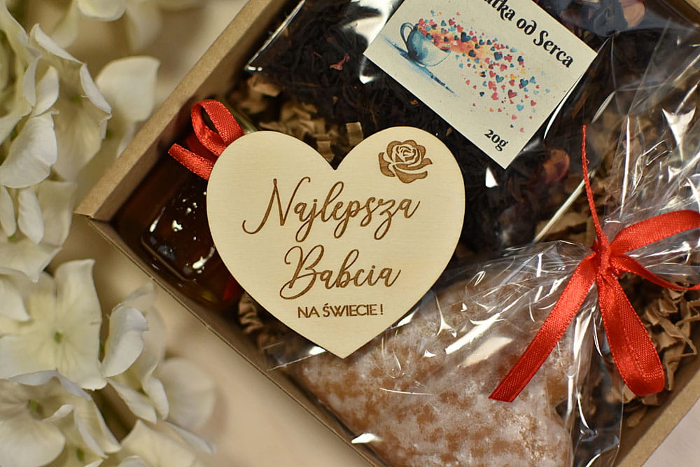 zestaw prezentowy na Dzień Babci i Dziadka z piernikiem, miodem i sercem magnesem