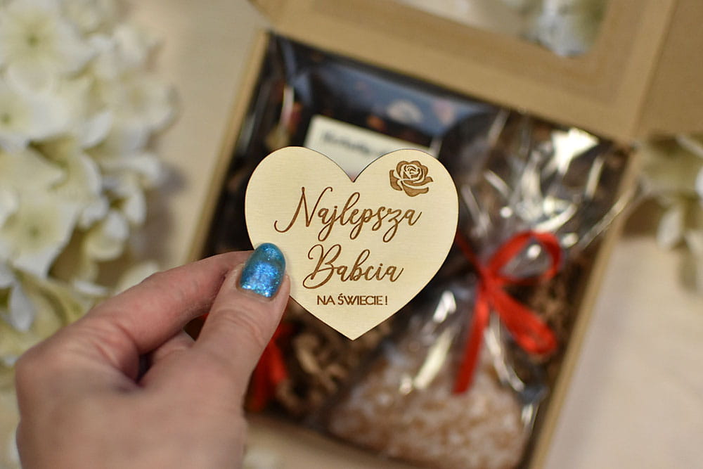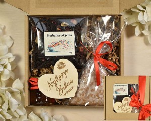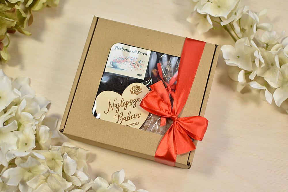 PAKOWANIE + PUDEŁKO: upominki są zapakowane w ekologiczne pudełko, przewiązane czerwoną tasiemką, całość jest gotowa do wręczenia